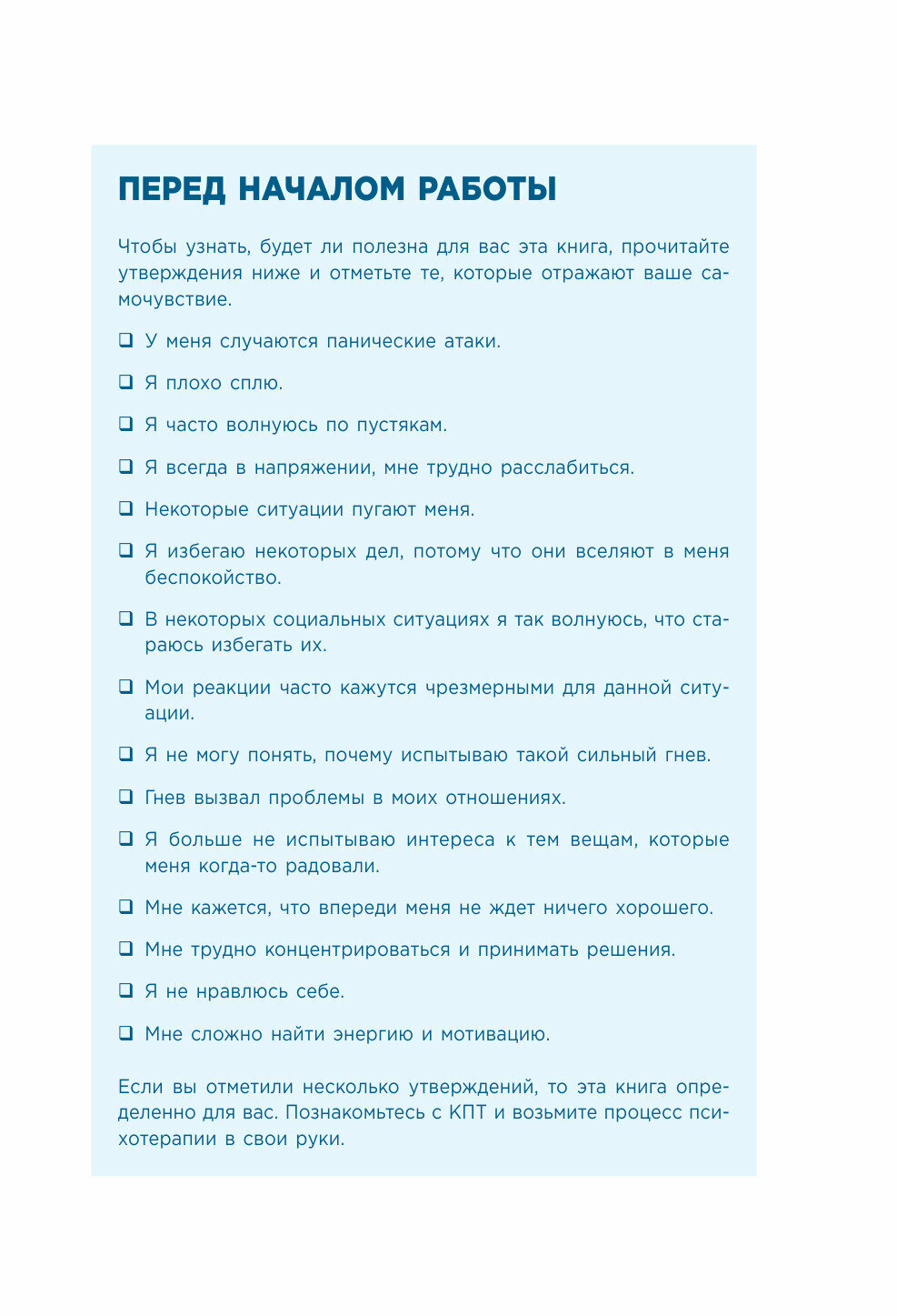 Время от времени каждый из нас вдруг попадает в жесткие тиски эмоций. Это может быть ощущение всепоглощающей тревоги или депрессия, высасывающая из жизни все краски, паника, которая накрывает в самые неподходящие моменты, частые вспышки гнева. Из этого воркбука вы узнаете, как справиться с психологическими проблемами. Обращайтесь к воркбуку так часто, как это будет необходимо.
