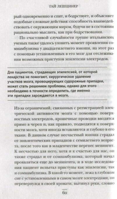 Книга интересная, наверное, даже не из-за того, что понимаешь особенности мозга, а благодаря историям о пациентах автора. Например, очень запомнился случай, как больной альцгеймером, который еле двигался во время бодрствования, во сне сел на корточки на кровати и начал активно размахивать руками, как крыльями, изображая, кажется, утку. И таких историй много.