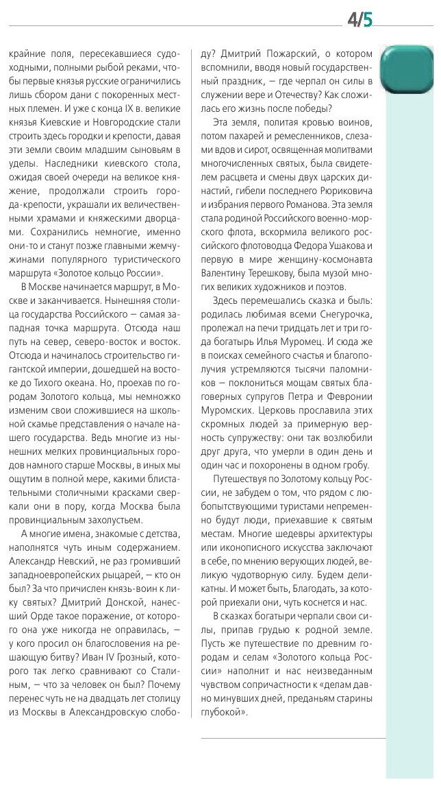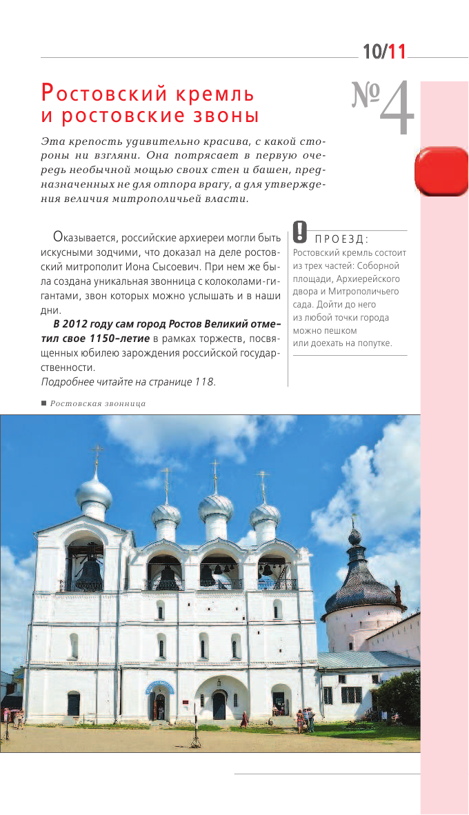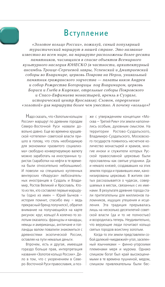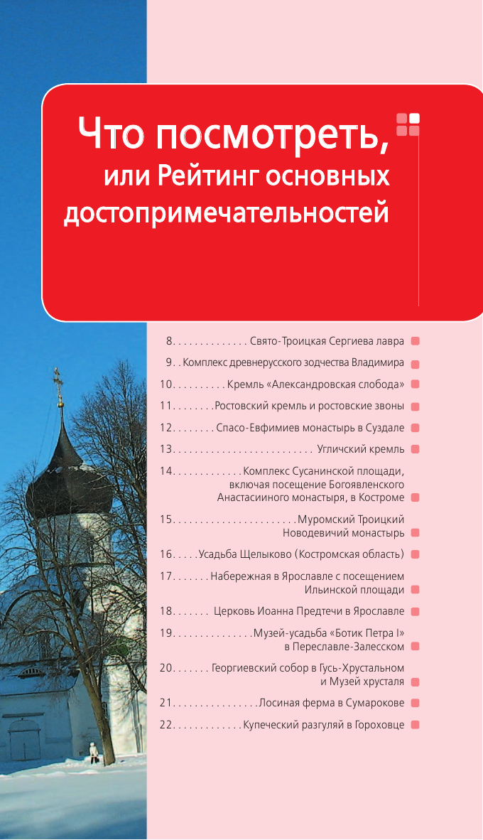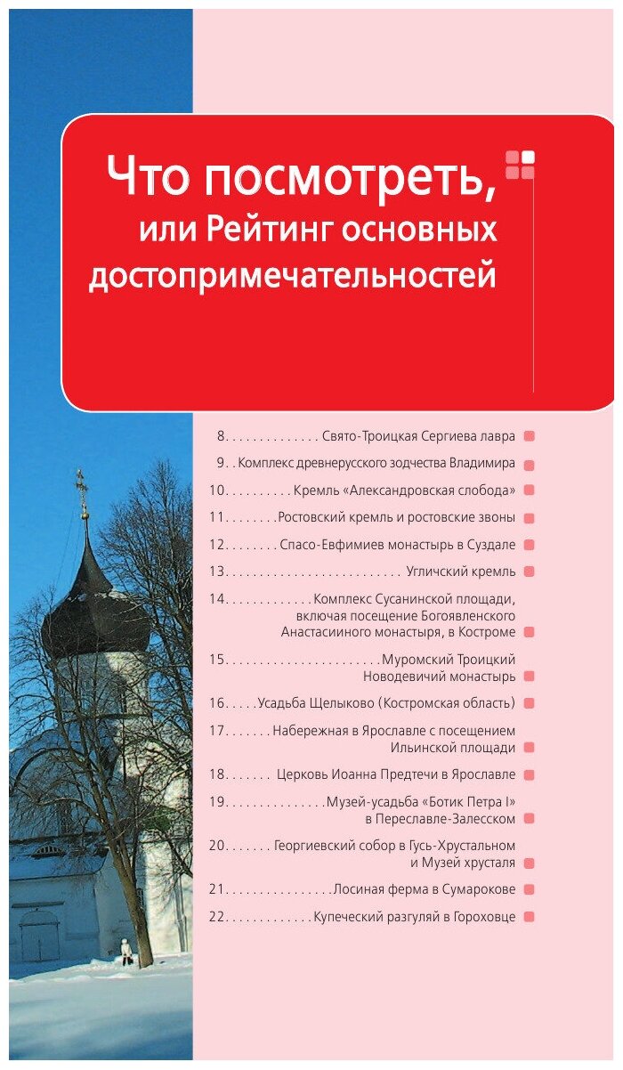 Содержит подробное описание 18 населенных пунктов Золотого кольца с обязательными разделами - где остановиться, что купить. где поесть, фестивали , когда ехать и пр.