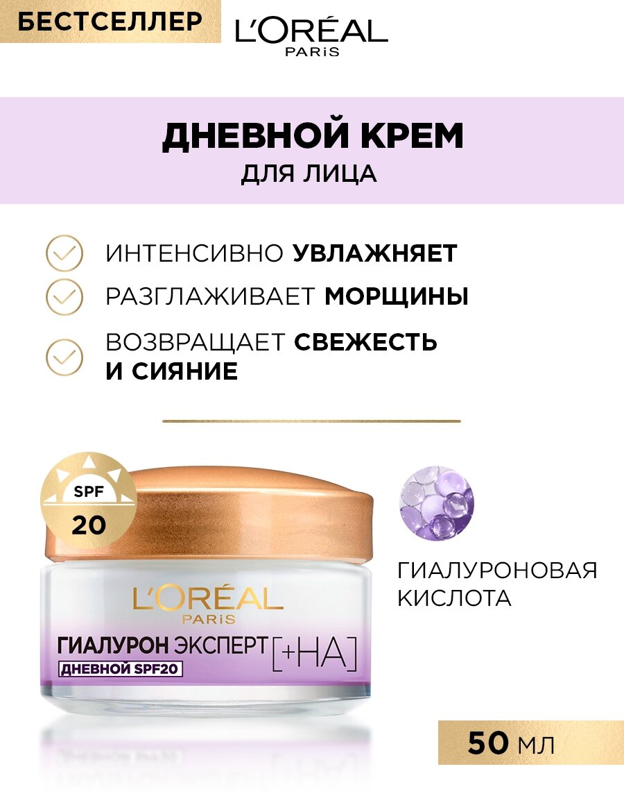 - L'Oreal Paris, Дневной крем для лица "Гиалурон Эксперт", SPF20, с гиалуроновой кислотой, 50 мл