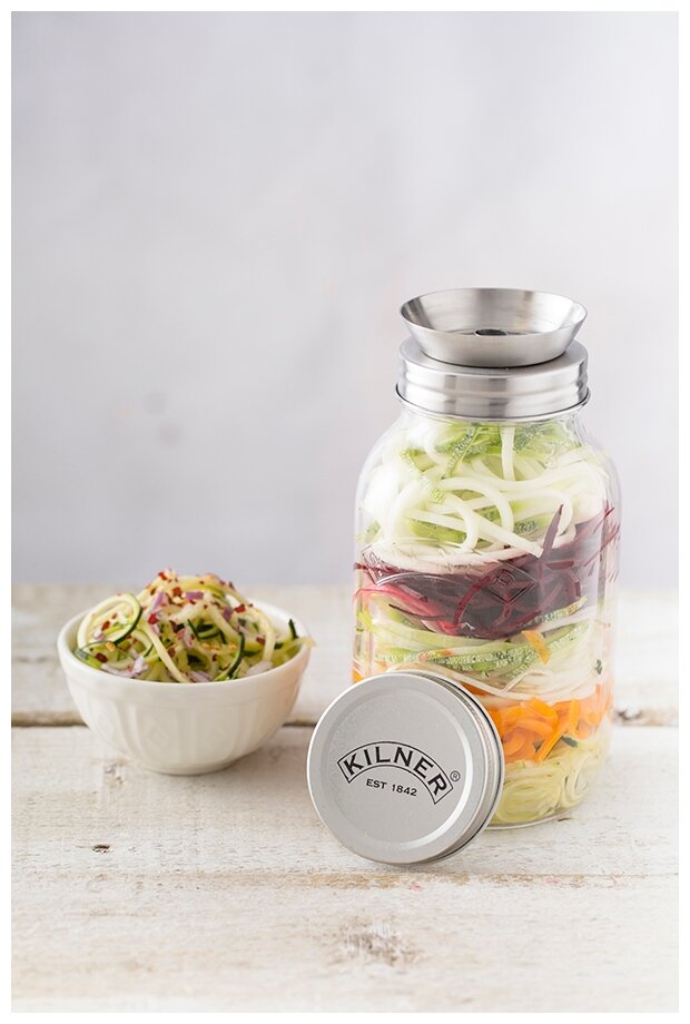 Уникальная банка создана дизайнерами Kilner специально для тех, кто следит за ЗОЖ-трендами. С помощью крышки с острым лезвием можно с лёгкостью приготовить спагетти из любого твёрдого овоща, для этого идеально подойдут морковь, цуккини, тыква, картофель, свекла и др. Измельчённые овощи можно приготовить на пару, поджарить или замариновать со специями. Просто закройте банку крышкой и поставьте в холодильник. Любители ланча в банке делают сразу несколько порций, которых хватает на неделю, и ставят в холодильник, откуда каждое утро перед работой берут с собой по банке с полезным перекусом.