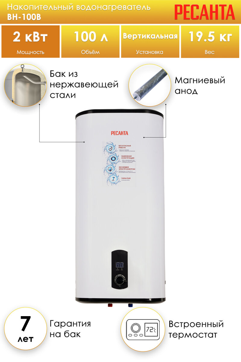 Водонагреватели электрические Ресанта серии ВН представлены в нескольких вариантах разного объема получаемой горячей воды, а некоторые модели имеют разный тип подключения. Агрегаты обеспечивают нагрев и сохранение воды в соответствии с потребностями пользователя. Длительному хранению вод способствует хорошая теплоизоляция бака. Так же предусмотрены различные меры по защите и безопасности водонагревателей.