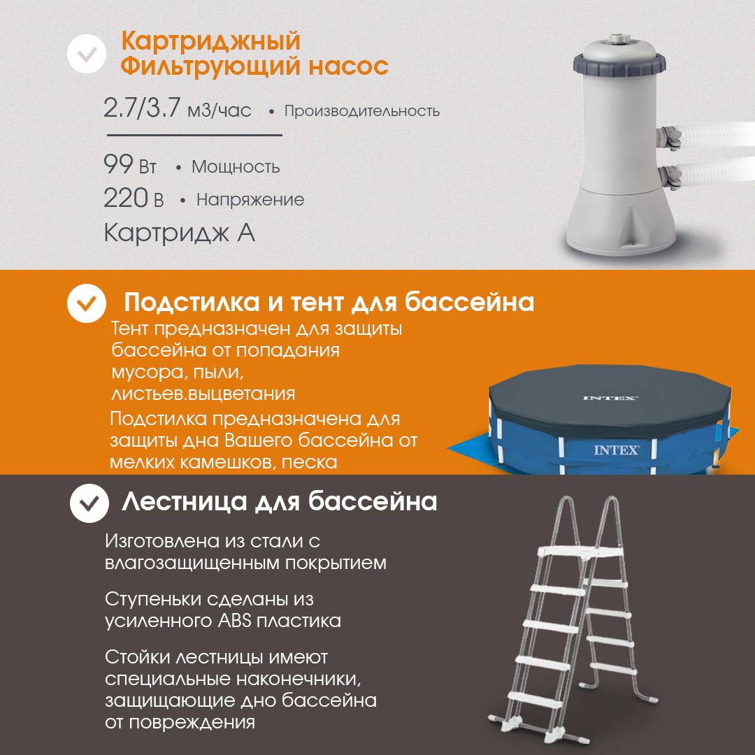 | Комплектация | картриджный фильтр-насос, лестница, подстилка, тент-чехол |