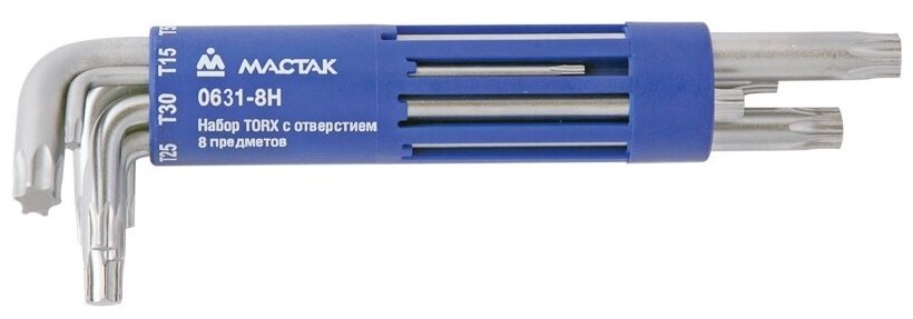 Набор Г-образных ключей TORX 0641-8HB от МАСТАК предназначен для работы с крепежом. Такие элементы часто используются в тормозных системах, топливной аппаратуре автомобиля. Ключи изготовлены из хром-ванадиевой стали, что придает инструменту прочность и упругость.