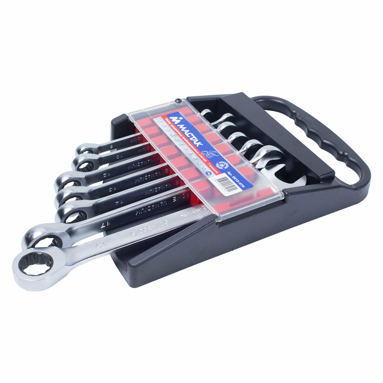 Набор комбинированных ключей МАСТАК включает в себя 7 трещоточных ключей с размерами 8-19 мм. Инструменты изготавливаются из качественной инструментальной стали и проходят термическую обработку, что придает им повышенную прочность и износостойкость.