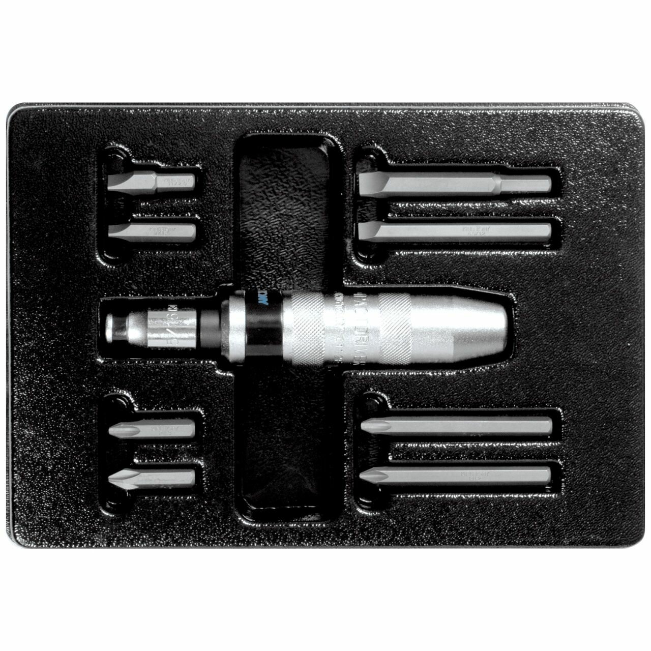 Набор инструментов 10 предметов ударная отвертка и насадки King Tony в ложементе из материала PVH (поливинилхлорида) предназначен для комплектации передвижных инструментальных тележек или слесарных верстаков при создании индивидуальных рабочих мест на станциях технического обслуживания автомобилей (СТОА) и других предприятиях, занимающихся обслуживанием и ремонтом различной техники.