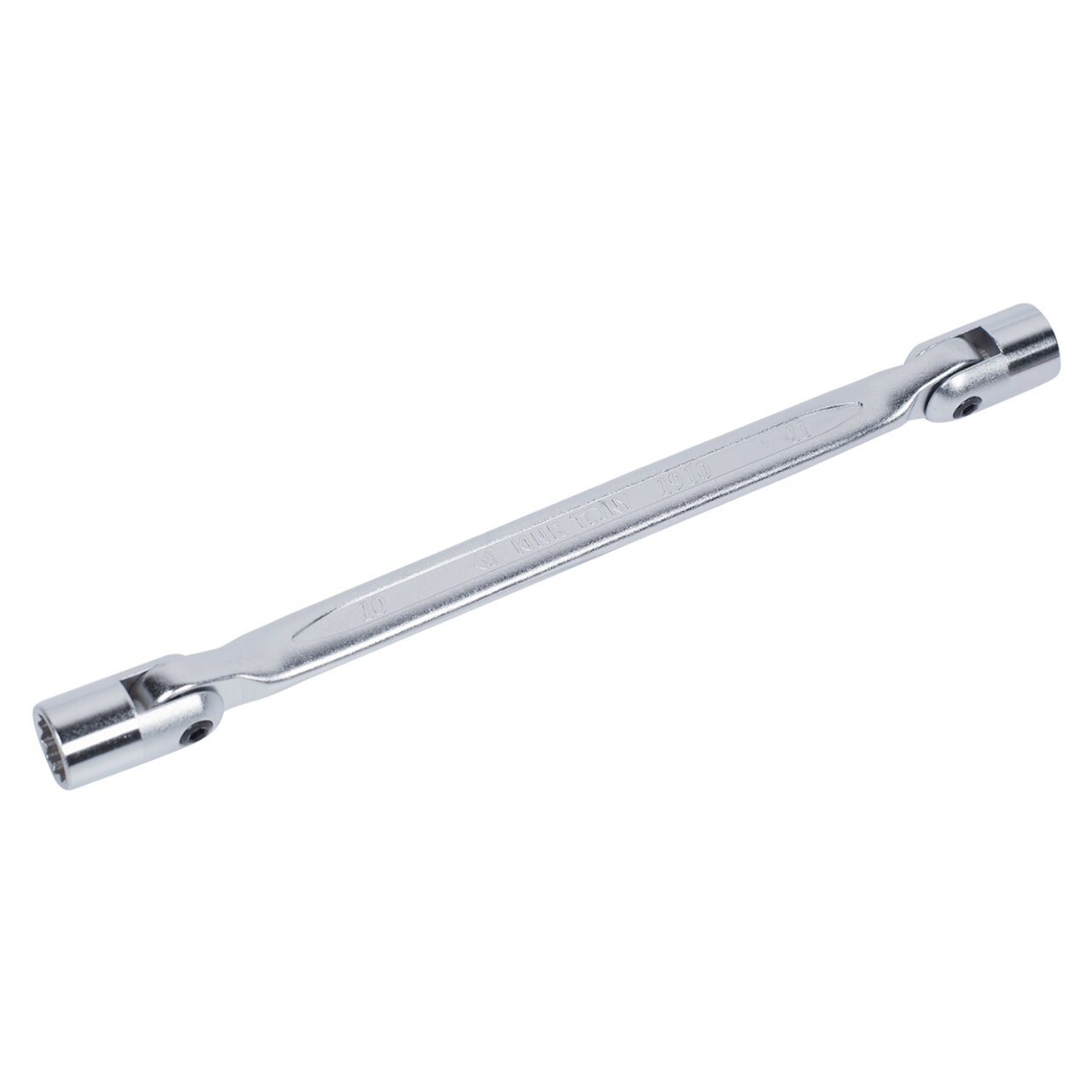 Ключ торцевой двухсторонний 10х11 мм с шарниром King Tony представляет собой профессиональный слесарный ручной инструмент, способный выдерживать регулярные и высокие нагрузки в условиях эксплуатации на станциях технического обслуживания автомобилей (СТОА) или в цехах тяжелых промышленных предприятий.