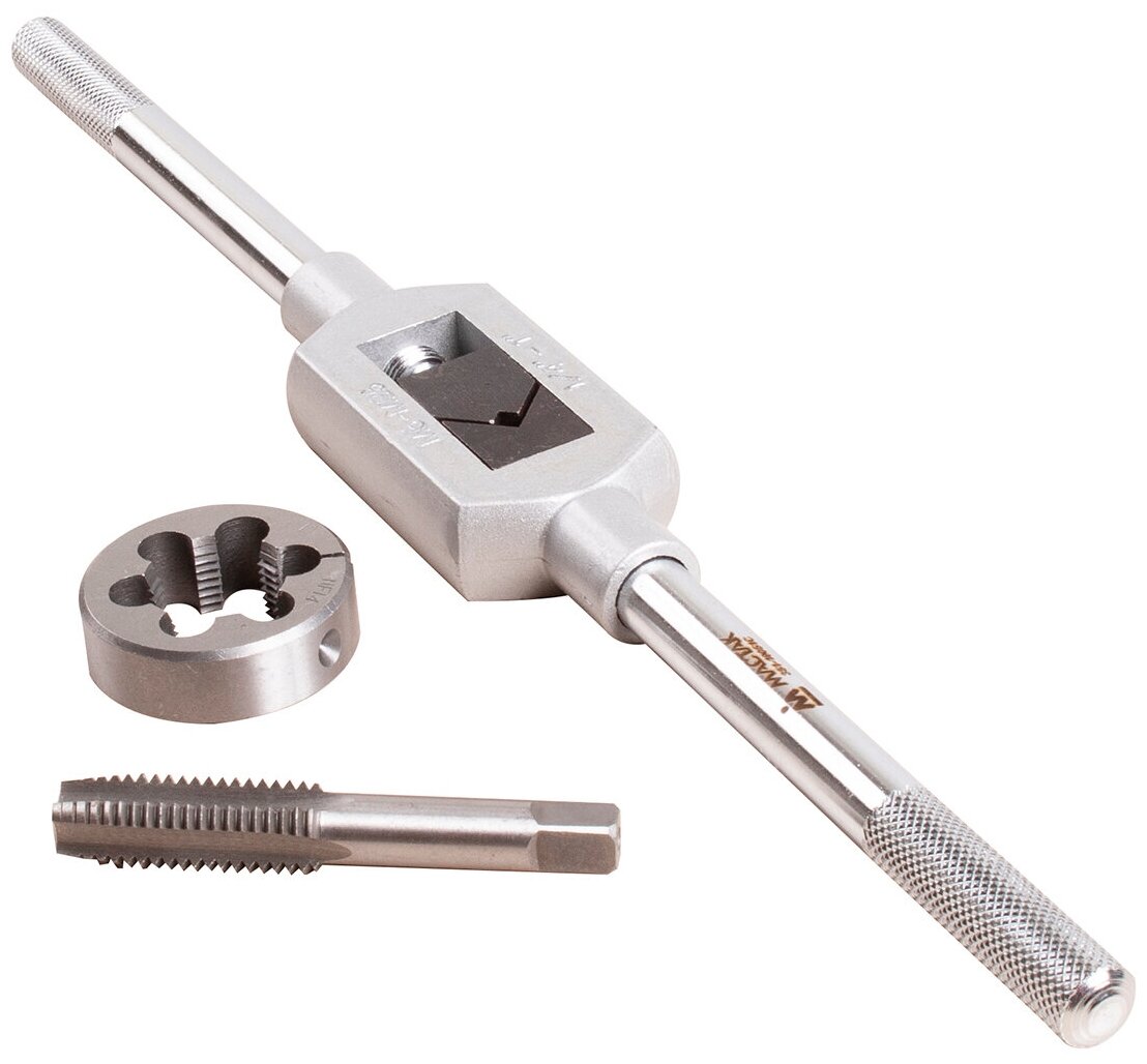 | Инструменты в наборе | метчик, метчикодержатель, плашка, плашкодержатель, отвертка, адаптер для плашкодержателя |