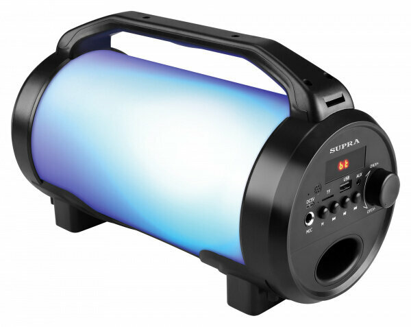Беспроводная акустика Supra BTS-655 цилиндрической формы с подсветкой и двумя динамиками общей мощностью 15 Вт работает от литий-ионного аккумулятора емкостью 1500 мАч. Автономно она может действовать до 4 часов. Подзаряжается модель через USB-порт. Он, а также разъемы AUX, TF и панель управления с механическими клавишами и переключателями расположены на торцевой части.LED-дисплей показывает выбранный режим. FM-тюнер позволяет слушать радио, а поддержка Bluetooth 4.2 — дистанционно подсоединять портативную колонку к смартфону или планшету, используя их в качестве пультов ДУ.