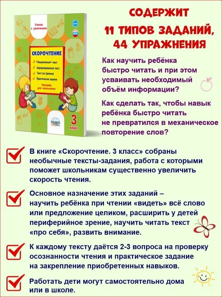 Сервис сравнения цен СкидкаГИД предлагает сравнить цены на товар «Книга: Скорочтение. 3 класс. Тренажёр для школьников (Светлана Петровна Казачкова); Планета, 2024»