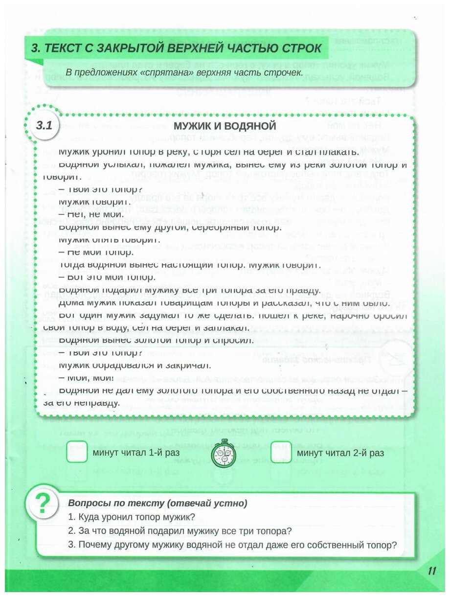 В этой книге собраны необычные тексты-задания, работа с которыми поможет школьникам существенно увеличить скорость чтения. Основное назначение этих заданий - научить ребёнка при чтении "видеть" всё слово или предложение целиком, расширить у детей периферийное зрение, научить читать текст "про себя", развивать внимание. К каждому тексту даётся 2-3 вопроса на проверку осознанности чтения и практическое задание на закрепление приобретенных навыков. Работать дети могут самостоятельно дома или в школе.
