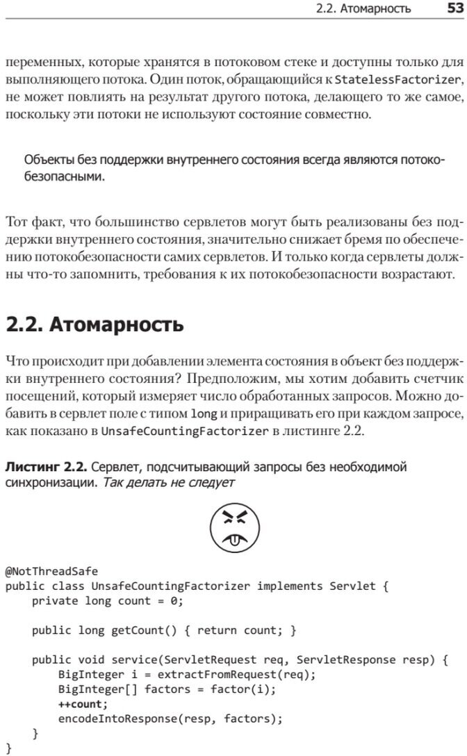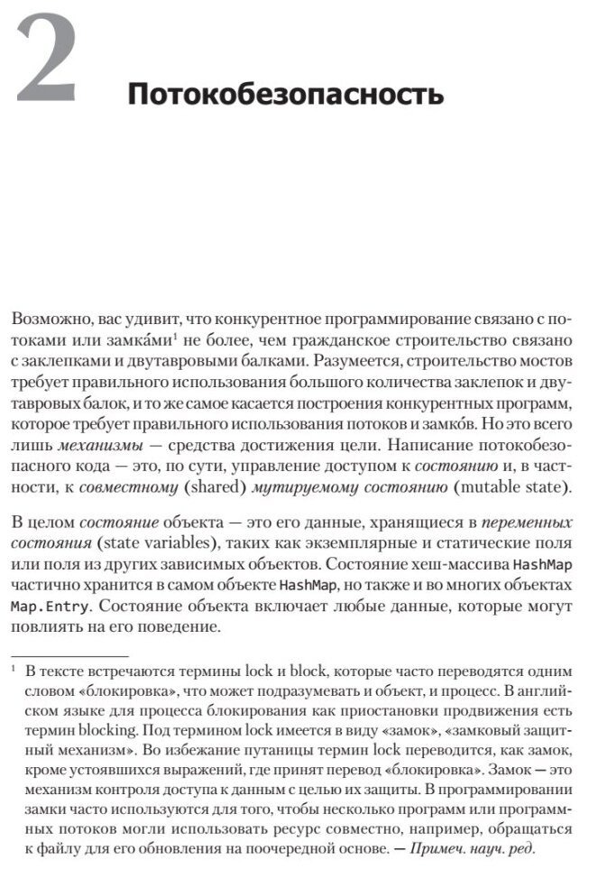 Книга ужасная, точнее её перевод. Такое ощущение что переводили Гугл переводчиком. Я бы постыдился такую книгу издавать. Так что читайте в оригинале. Прикрепил картинку с куском текста: "Классы, использующие замковую защиту, должны документировать, какие переменные состояния защищены замками... ". Ну читаешь и просто волосы встают дыбом!