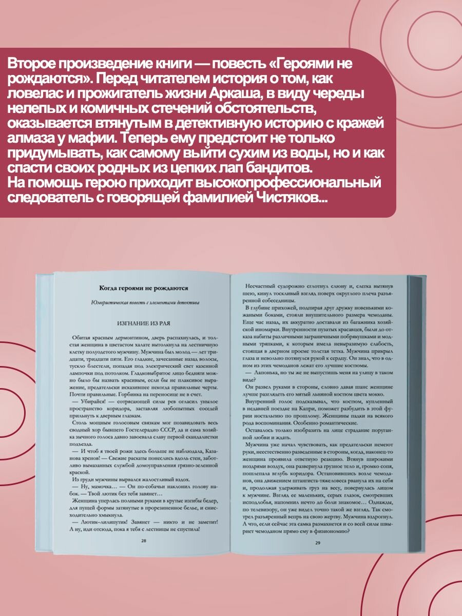 Второе произведение книги - повесть "Героями не рождаются". Перед читателем история о том, как ловелас и прожигатель жизни Аркаша, в виду череды нелепых и комичных стечений обстоятельств, оказывается втянутым в детективную историю с кражей алмаза у мафии. Теперь ему предстоит не только придумывать, как самому выйти сухим из воды, но и как спасти своих родных из цепких лап бандитов. На помощь герою приходит высокопрофессиональный следователь с говорящей фамилией Чистяков…