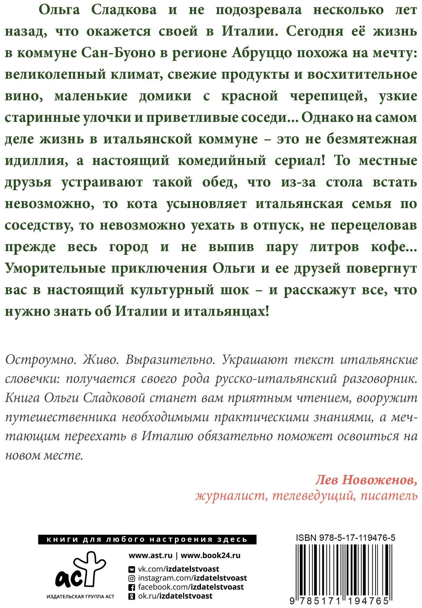 Ольга Сладкова и не подозревала несколько лет назад, что окажется своей в Италии. Сегодня ее жизнь в коммуне Сан-Буоно в регионе Абруццо похожа на мечту: великолепный климат, свежие продукты и восхитительное вино, маленькие домики с красной черепицей, узкие старинные улочки и приветливые соседи... Однако на самом деле жизнь в итальянской коммуне - это не безмятежная идиллия, а настоящий комедийный сериал! То местные друзья устраивают такой обед, что из-за стола встать невозможно, то кота усыновляет итальянская семья по соседству, то невозможно уехать в отпуск, не перецеловав прежде весь город и не выпив пару литров кофе... Уморительные приключения Ольги и ее друзей повергнут вас в настоящий культурный шок - и расскажут все, что нужно знать об Италии и итальянцах!