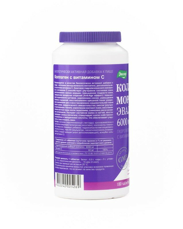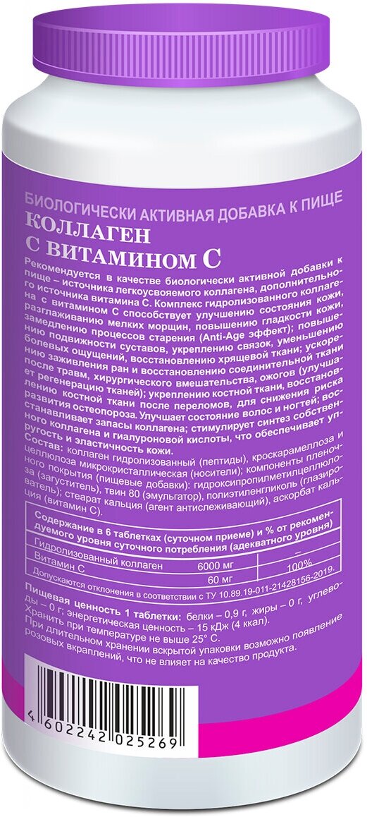 Сведения о составе: Коллаген гидролизованный пептиды, компоненты пленочного покрытия пищевые добавки : гидроксипропилметилцеллюлоза загуститель, полиэтиленгликоль глазирователь ; кроскарамеллоза и целлюлоза микрокристаллическая носители, кальций стеарат агент антислеживающий, аскорбат кальция витамин С .