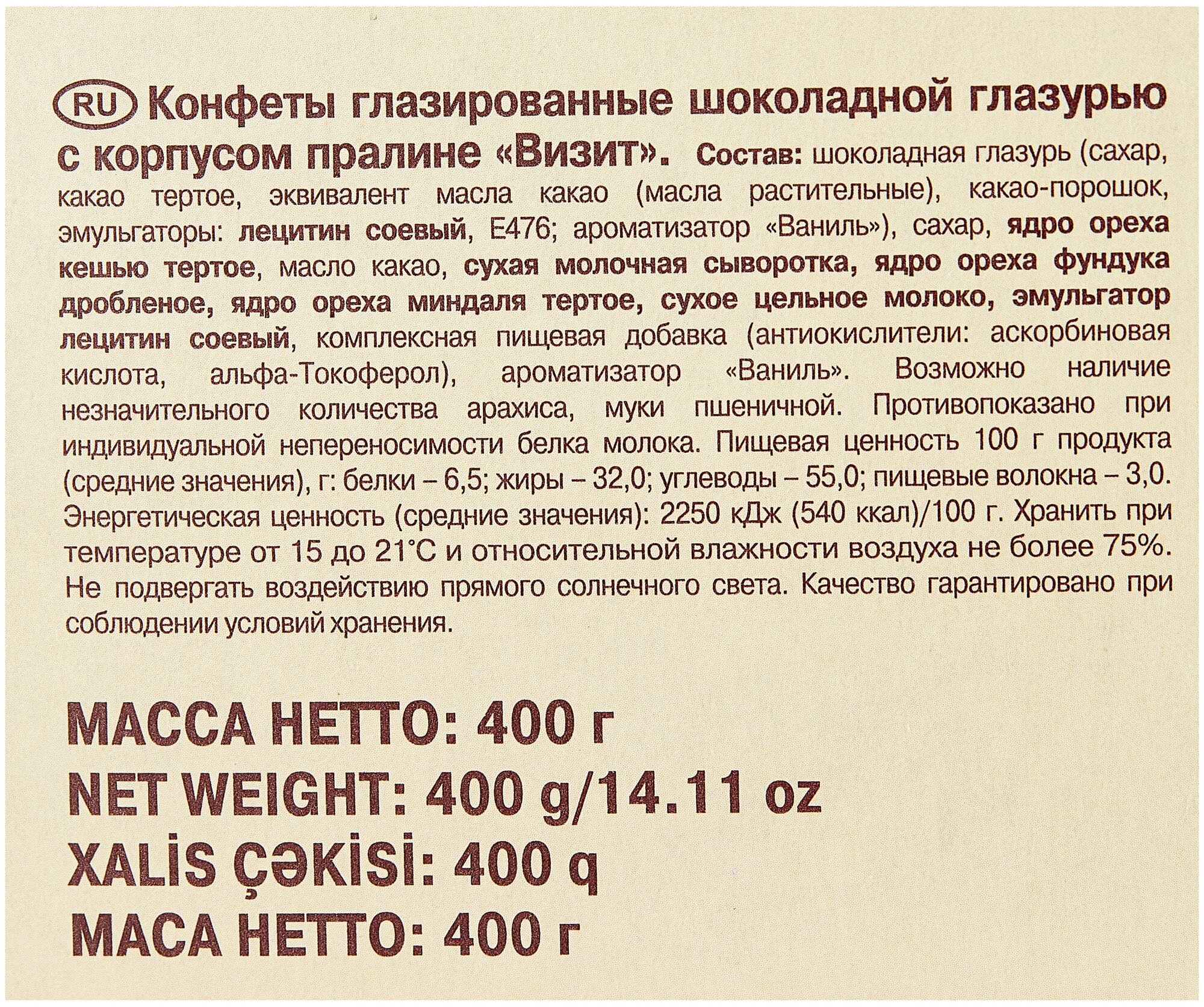Состав товара:Шоколадная глазурь (сахар, какао тертое, эквивалент масла какао (рафинированные дезодорированные, фракционированные, негидрогенизированные растительные масла (пальмовое, ши)), какао-порошок, эмульгаторы: лецитин соевый, Е476, ароматизатор «Ваниль»), сахар, сухое цельное молоко, ядро ореха кешью тертое, ядро ореха миндаля тертое, масло какао, ядро ореха фундука дробленое, эмульгатор лецитин соевый, антиокислитель аскорбиновая кислота, ароматизатор «Ваниль». Противопоказано при индивидуальной непереносимости белка молока. Возможно наличие незначительных количеств арахиса, муки пшеничной.