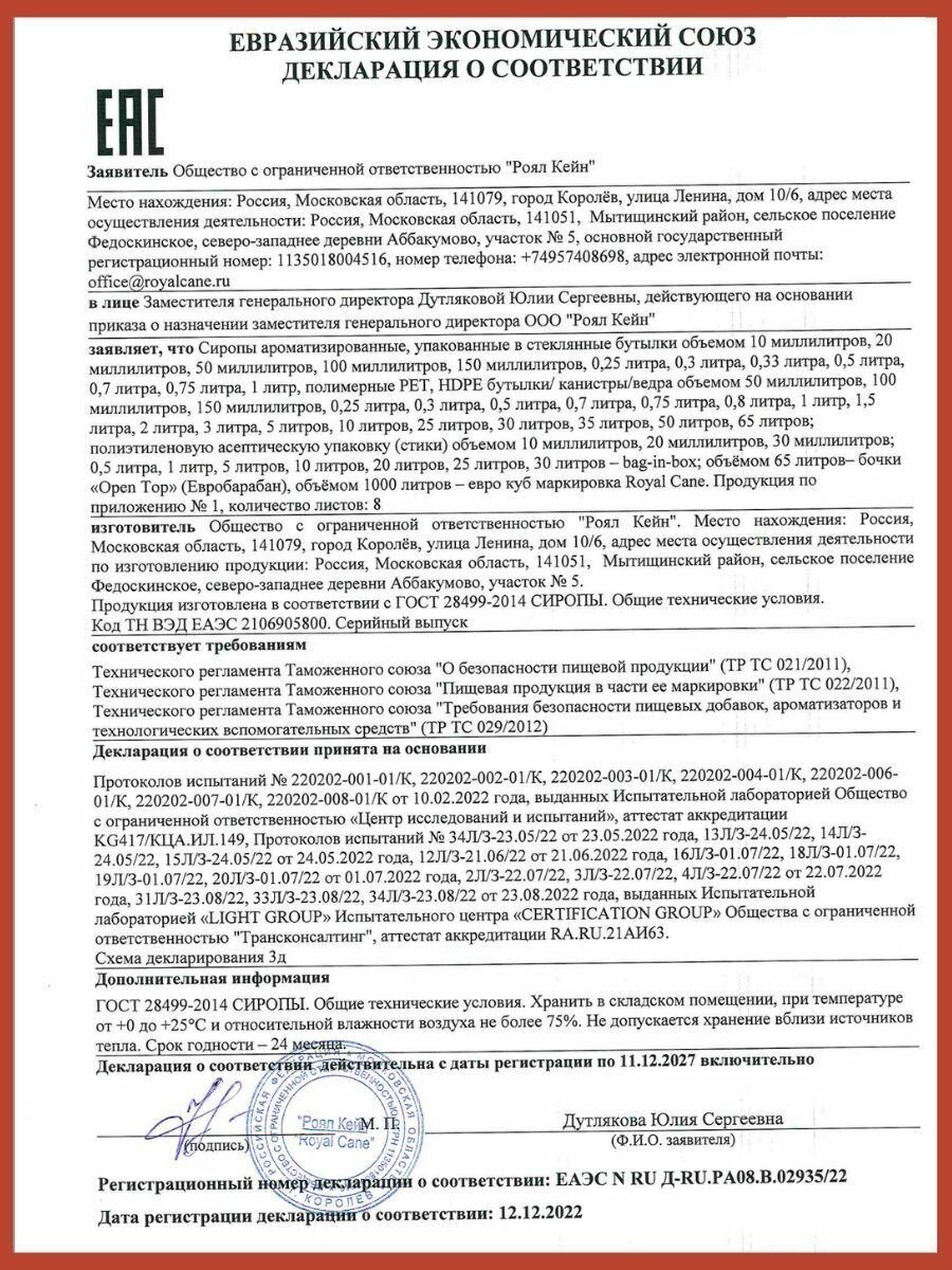 Сироп Глинтвейн торговой марки Royal Cane изготовлен с использованием только натуральных ингредиентов, которые специалисты компании тщательно отбирают у проверенных и надежных поставщиков, строго на основе требований СанПин 2.3.2.1078-01 п.п. 1.8.5.6.и выпускается по ГОСТ 28499-2014. В процессе производства не используются заменители сахара, подсластители, искусственные пищевые красители и консерванты, усилители вкуса и ГМО-продуты, что свидетельствует о натуральности и безопасности сиропа. Сироп Глинтвейн имеет вкус самого популярного зимнего одноименного напитка, согревающего коктейля на основе вина с добавлением специй. Безалкогольная добавка отличается ярким алым цветом, высокой густотой и поразительным ароматом, при этом великолепно растворяется в напитках, раскрывая все свои грани, предавая им насыщенный аромат. Широко применяется в качестве ингредиента как профессионалами в ресторанах, кофейнях и барах, так и в домашних условиях для приготовления латте, капучино, эспрессо, чая и милкшейков. Прекрасно подходит в качестве дополнения вкуса десертов, мороженого, фруктовых салатов, блинов и панкейков, пропитки бисквитных коржей для пирожных и тортов, выпечки и печенья. Помимо этого, сироп добавляют в алкогольные коктейли на основе водки, джина, виски и рома. Купив сироп Глинтвейн торговой марки Royal Cane Вы можете сделать прекрасный подарок как себе так и своим родным и друзьям, которые являются ценителями кофе или любителями коктейльных вечеринок и домашней кулинарии.Компания Royal Cane является одним из лидеров российского рынка производителей сиропов, топпингов и фруктовых пюре для напитков и кулинарии. В ассортиментном портфеле компании более 200 разнообразных продуктов на основе натуральных концентрированных соков, ягод и фруктов шоковой заморозки.