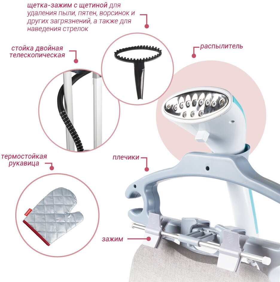 | Комплект поставки | Отпариватель, стойка, варежка, вешалка для одежды, складные плечики с зажимами, универсальная щетка-насадка, съемный гладильный столик, документация |