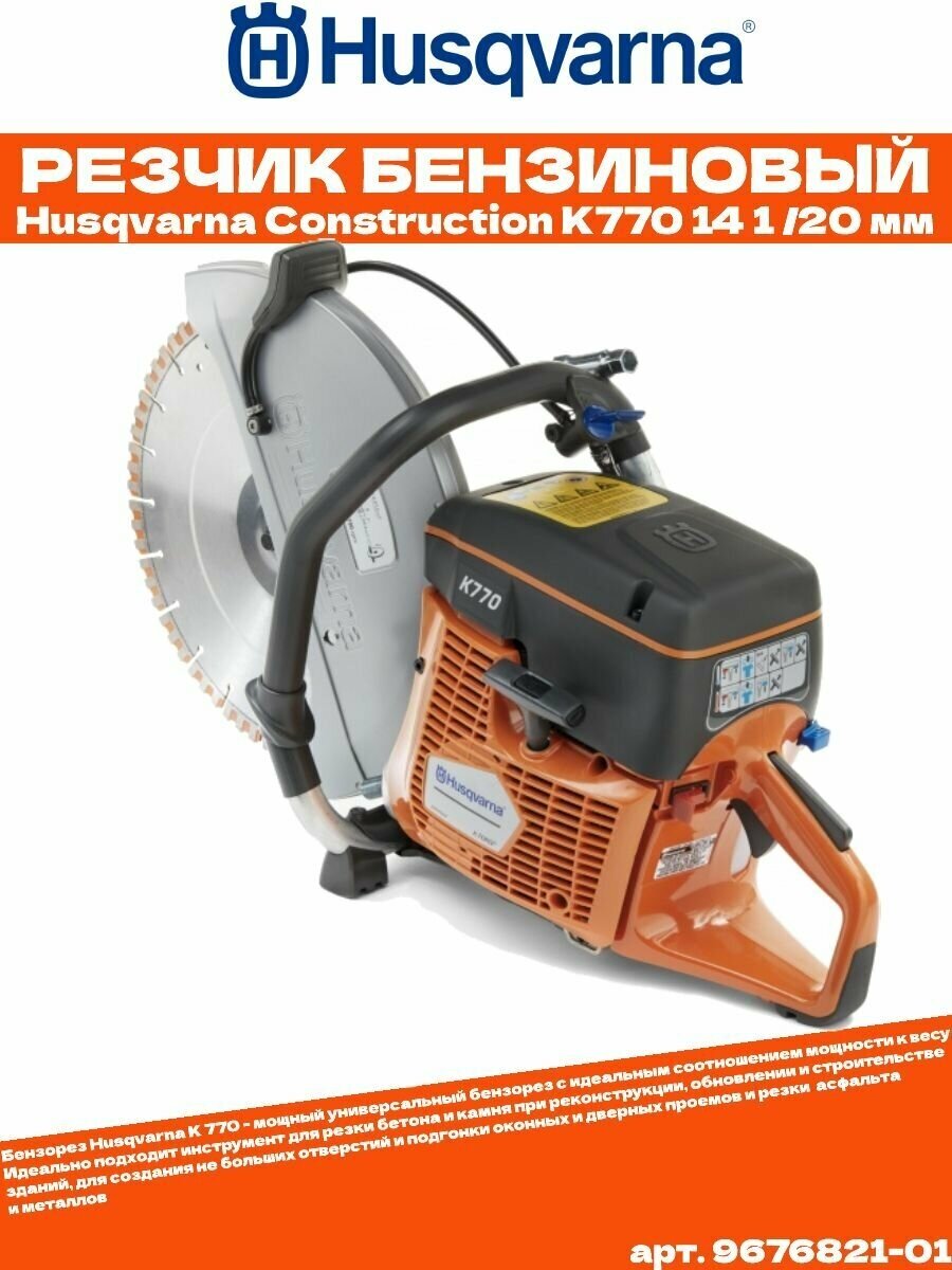 Бензорез Husqvarna K 770 (ф350х14) – мощный, универсальный инструмент. Имеет превосходное соотношение мощности к весу, надежный запуск и низкий уровень вибрации, максимальную производительность. Цифровое зажигание с оптимизированной синхронизацией обеспечивает мощную искру синхронно с оптимизированным впрыском топлива, что упрощает запуск и повышает эффективность сгорания топлива. Данный бензорез отлично подходит для резки бетона, асфальта, резки металлов при проведении аварийно-спасательных и дорожных работ. Мощность инструмента 3700 Вт. Рабочий объем цилиндра 74 кубических сантиметра. Есть индикатор уровня топлива. Двигатель двухтактный. Диаметр диска 350 мм. Максимальное число оборотов холостого хода 2700 об/мин. Глубина реза 125 мм.