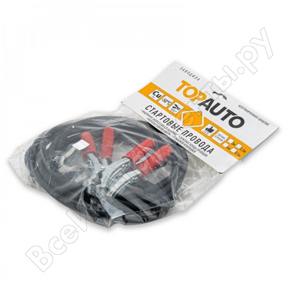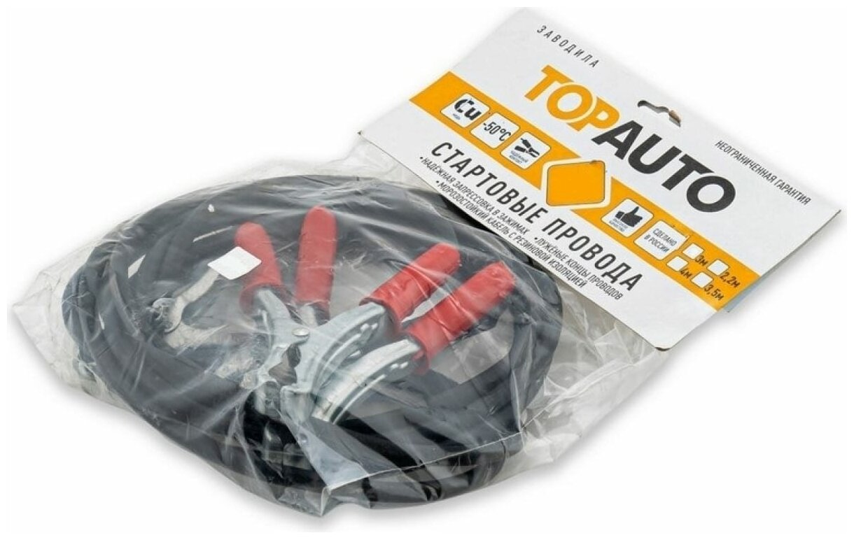 Медные стартовые провода прикуривания "Топ Авто" (TopAuto) разработаны для запуска двигателей легковых и грузовых автомобилей, а также коммерческого автотранспорта и прочих ТС с разряженным аккумулятором - вне зависимости от погодных условий! Такие пусковые провода можно использовать и для других быстросъемных силовых электросоединений. В основе этих пусковых автомобильных проводов прикуривателя (другое название - провода для прикуривания автомобиля) лежит медный кабель отечественного производства. Изоляция для проводов, которую также часто называют оплетка - резина. Рабочая температура - до -50C. В зависимости от конкретной модели проводов в качестве упаковки для транспортировки и хранения проводов может быть использована практичная сумка-чехол на молнии или пакет. Зажимы-крокодилы для проводов «Стандарт» или большие. Область применения определяется максимально возможным значением силы тока в амперах и в зависимости от характеристик конкретной модели может охватывать весь спектр транспортных средств! Важное конкурентное преимущество этих стартовых проводов – их надежная запрессовка в зажимах, а также лужение концов проводов; вместе данные особенности минимизируют риск отсоединения и вероятность потери контакта. Медные стартовые провода с удобными крокодилами – незаменимый для каждого автомобилиста автоаксессуар, эффективный и надежный! Отличный подарок для мужчины-автолюбителя, а также для автоледи. Пожизненная гарантия!