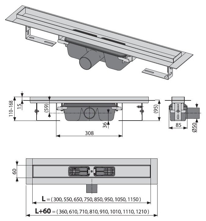 APZ6 Professional - водоотводящий желоб с порогами для цельной решетки горизонтальный слив. Область применения: - Для использования внутри помещений - Для водоотведения в душевых на уровне пола - Может располагаться в пространстве или непосредственно у стены - Для цельной решетки - Для безбарьерного доступа Свойства: - Водоотводящий желоб из нержавеющей стали (обработанной методом травления и пассивации, а также прошедшей электрохимическую полировку) - Предназначен для цельных решеток из нержавеющей стали, закаленного стекла, искусственного камня и их различных комбинаций. - Высота монтажа от 95 мм - Регулируемый по высоте - Сифон прочно соединяется с желобом и гарантирует 100% водонепроницаемость - Самоклеящиеся ленты для качественной гидроизоляции - Вручную легко чистящийся сифон, вплоть до сточной трубы - Воротник и гидрозатвор защищены специальной пленкой, лоток для решетки защищен вкладышем из пенопласта - Высокая скорость стока возможна благодаря двухкамерному сифону - Возможность изготовления с комбинированным гидрозатвором (только для стандартных сифонов) - Гарантия 25 лет - Материал желоба: нержавеющая сталь AISI 304, DIN 304, CSN 17240 - Материал сифона: полипропилен Технические параметры: - Гидрозатвор 50 мм - Скорость стока воды 60 л/мин. - Сопротивление гидрозатвора 982 Па - Диаметр сливной трубы 50 мм - Минимальная толщина бетона 95 мм - Общая высота монтажа (H2) 110 - 168 мм - Максимальная нагрузка 300 кг Содержание комплекта - Водоотводящий желоб с сифоном - Монтажный комплект: шуруп d6x50 - 2 шт, дюбель d10 - 2 шт. - Самоклеящиеся гидроизоляционные ленты - Защитная пленка для воротника желоба и впускного отверстия сифона - Монтажный вкладыш для защиты лотка желоба - Монтажный комплект для крепления регулируемых ножек: болт M6x12 - 2 шт.