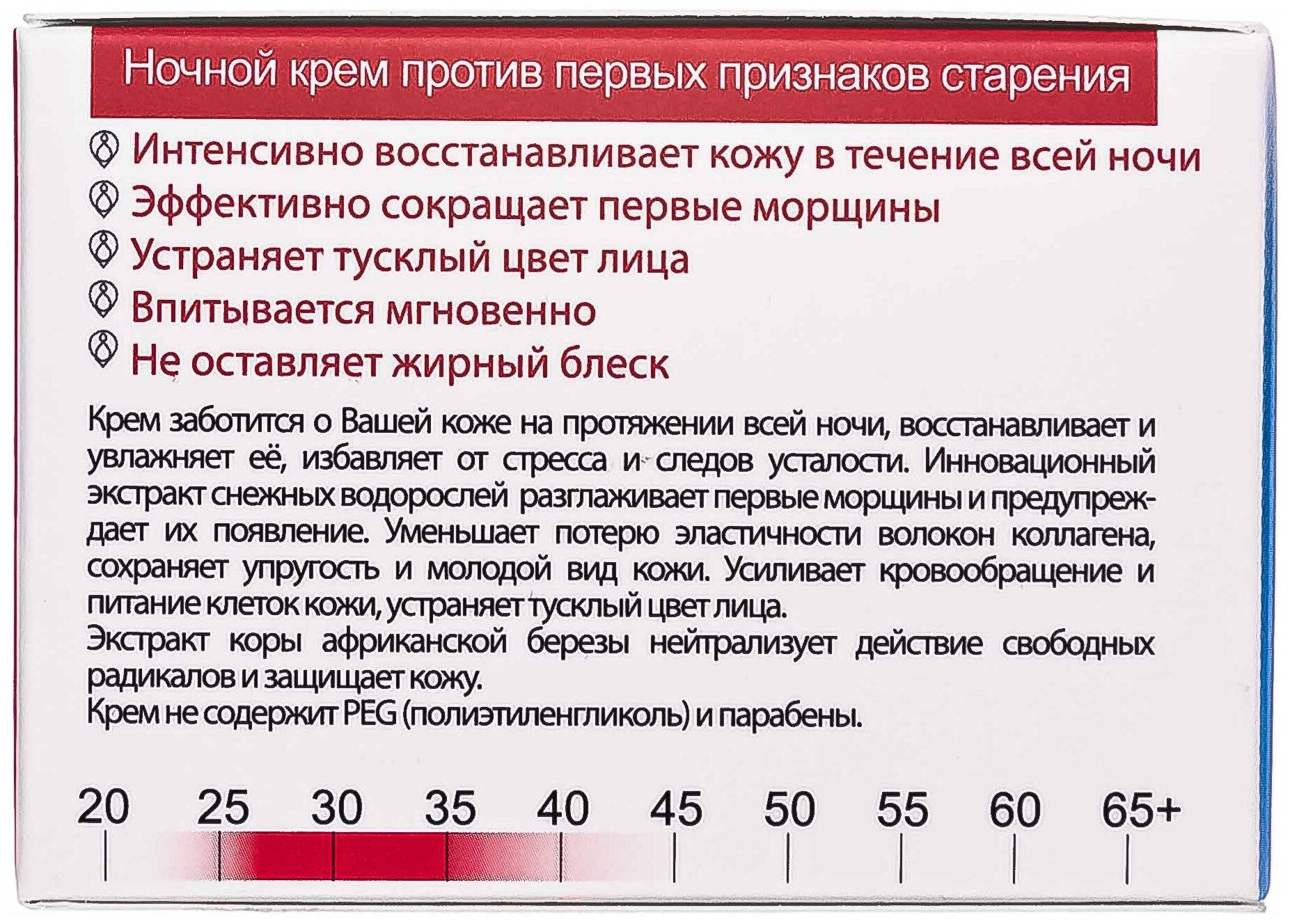 | Применение | нанесите крем вечером на очищенную кожу лица легкими массажными движениями. Избегайте область вокруг глаз |