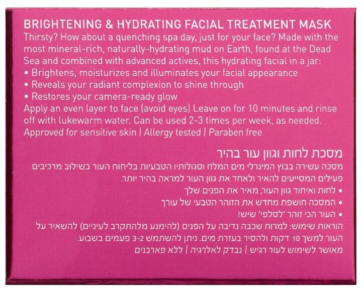 | Полное описание | Увлажняющая и придающая сияние маска для лица содержит невероятно богатую минералами грязь Мертвого моря. освежает кожу, раскрывая здоровое сияние вашего лица глубоко и пролонгированно увлажняет маска одобрена для чувствительной кожи |