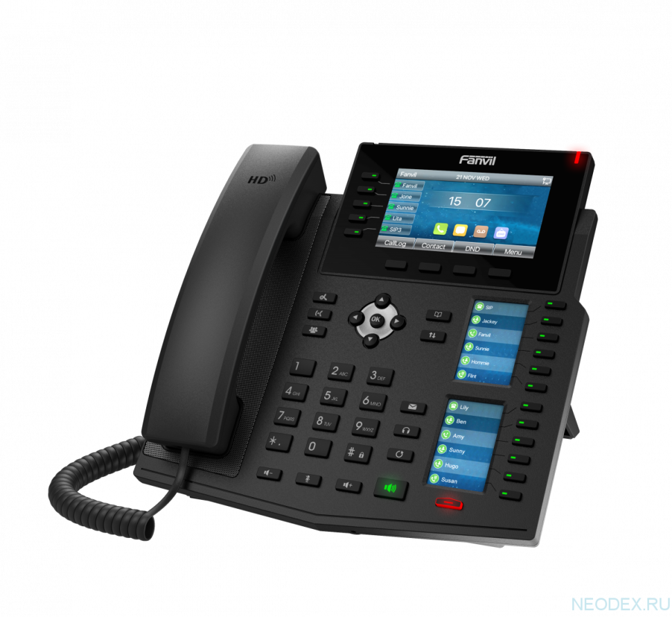 Fanvil X6U имеет цветной дисплей, второй 12-ти строчный ЖК-дисплей с подсветкой (5 страниц, 60 клавиш), встроенный Bluetooth, до 2000 имен в памяти телефона, USB-порт, 2 гигабитных LAN порта. VoIP-телефон Fanvil X6U идеально подходит для установки на стойке регистрации и везде, где необходим контроль, благодаря 60 программируемым клавишам, большому цветному дисплею, который также обеспечивает декодирование видео для отображения с совместимой IP-видеокамеры или даже IP-видеодомофона. Дисплей может отображать вызовы с IP видеодомофона (с видеокодеком H.264 и разрешением изображения 480P или ниже) с использованием USB-ключа WiFi WF20. Fanvil X6U позволяет использовать один и тот же сетевой кабель локальной сети для подключения как IP-телефона, так и компьютера (или другого устройства) без снижения скорости передачи данных благодаря встроенному коммутатору с 2 портами PoE LAN. Поддержка электронного микролифта APD80 для использования беспроводных наушников Plantronics. EHS20 для беспроводных наушников Jabra. Совместим с наушниками Jabra (проводными) с помощью кабеля EZD-QD002. Предлагается использование с беспроводными Bluetooth наушниками Sennheiser MB Pro 1 и MB Pro 2. Fanvil X6U оснащен USB-портом для подключения WiFi-адаптера.