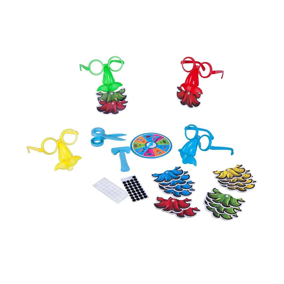 В комплект входит: очки - 4 шт., барабан, усы - 16 шт., ножницы, бритва, набор липучек.