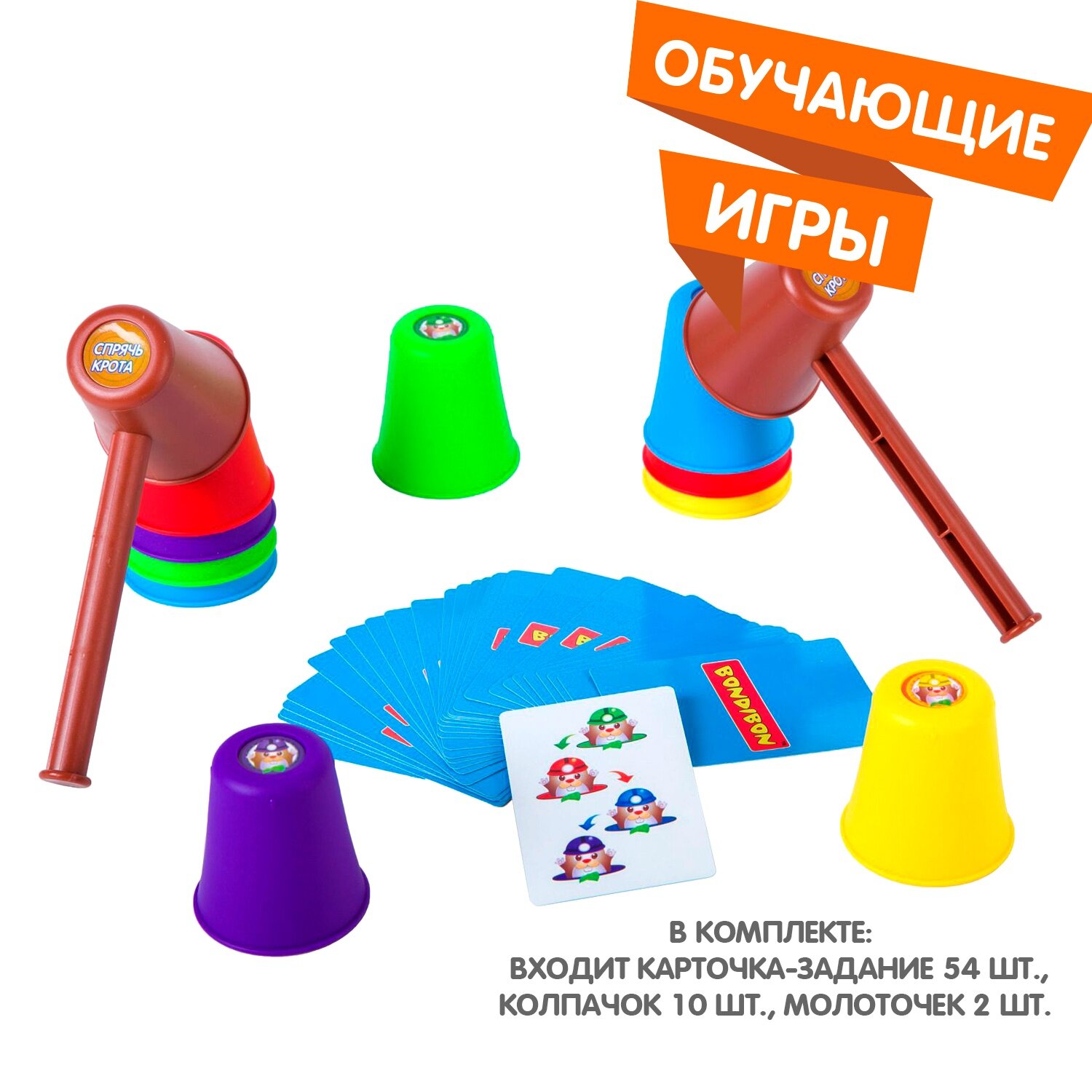 гра Bondibon Спрячь крота ВВ2420 на ловкость рук и остроту глаза. Способствует развитию зрительно-моторной координации движений, концентрации внимания и зрительного восприятия. Проведите веселое время с пользой в кругу семьи и друзей. Правила игры: Соберите колпачки как можно быстрее в порядке указанном на карточках с заданиями и накройте молоточком пирамидку. В каждом раунде игроки соревнуются, кто правильно выполнит задание и соберет наибольшее количество карточек.