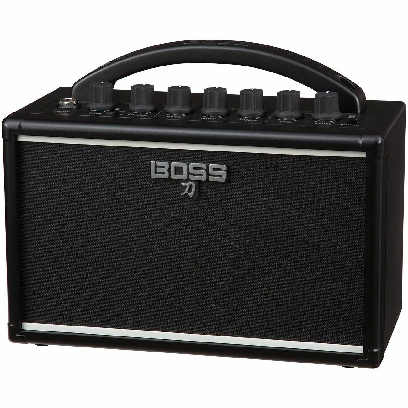 BOSS портативный аналоговый гитарный комбоусилитель, модель из популярной серии Katana от знаменитого производителя Boss. Это бюджетная модель, самая лёгкая и компактная в линейке. Вес комбика всего 1,2 кг, что позволяет легко переносить его и транспортировать, играть в любом удобном месте. Сверху имеется удобная прочная ручка. Электропитание может осуществляться от опционального сетевого адаптера или стандартных батарей (аккумуляторов) типа АА. 6 батарей обеспечивают до 7 часов непрерывного использования усилителя.