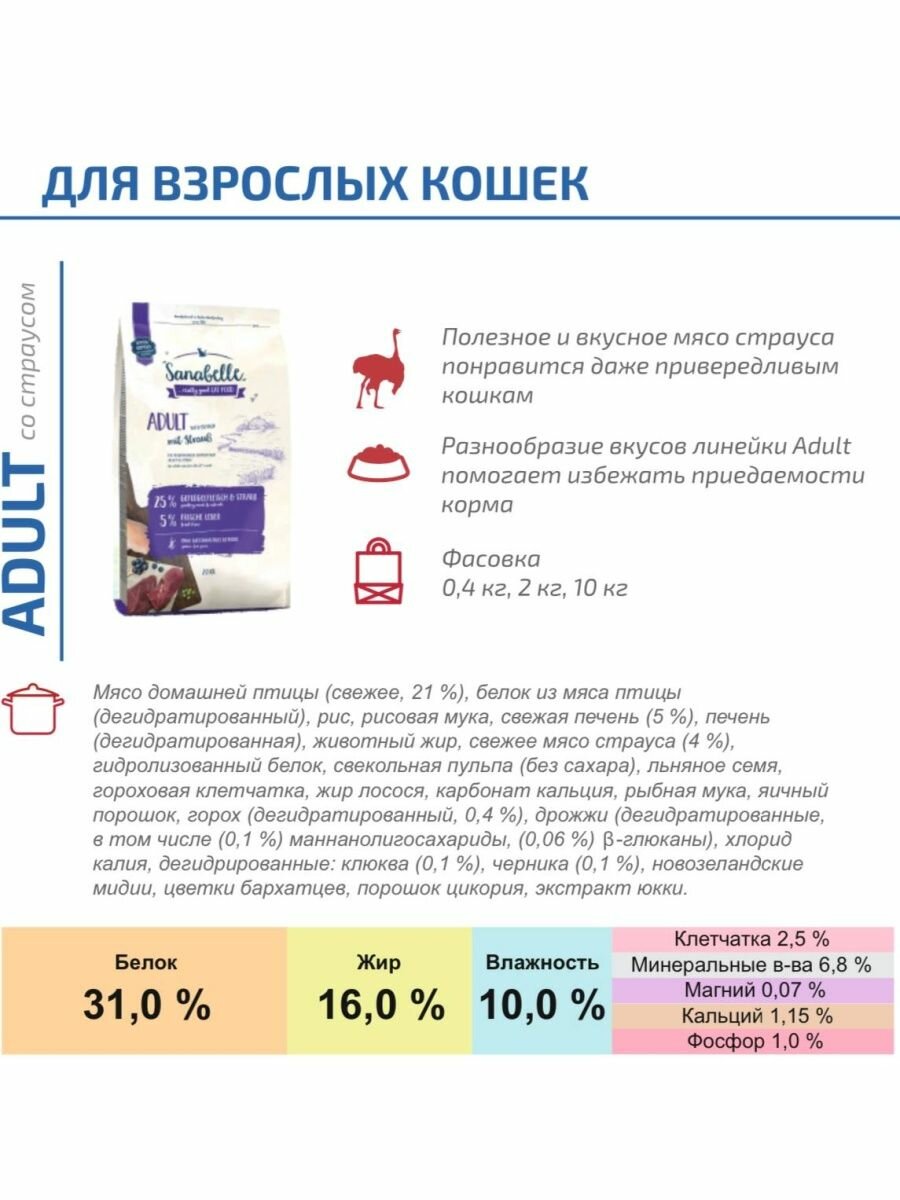 Sanabelle Adult with Ostrich. Сухой корм Санабель с мясом страуса предназначен для взрослых кошек всех пород. По ингредиентному составу относится к кормам суперпремиум класса. Содержит все витамины и минеральные вещества необходимые для повседневного здорового питания вашего питомца.