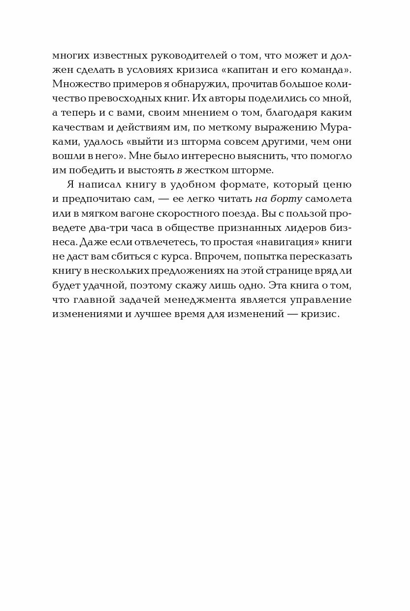 Книга о том, как организовывать свою деятельность во время кризисов. Несмотря на то, что книга адресована на топовые, тем не менее любой сотрудник и домохозяйка почерпнуть много полезной информации из неё. Книга написана о действиях в не простых для любой организации ситуациях, в этих случаях помочь человеку и организации может только мобилизация лучших качеств и дисциплина. Книга написана на большом и успешном опыте выхода из сложных кризисных ситуаций. Материал изложены предельно просто без лишних добавленйя. Хочется отметить то, что и оформлена книга идеально для бюджетного варианта: чёткий аккуратный текст, не мажется шрифт.