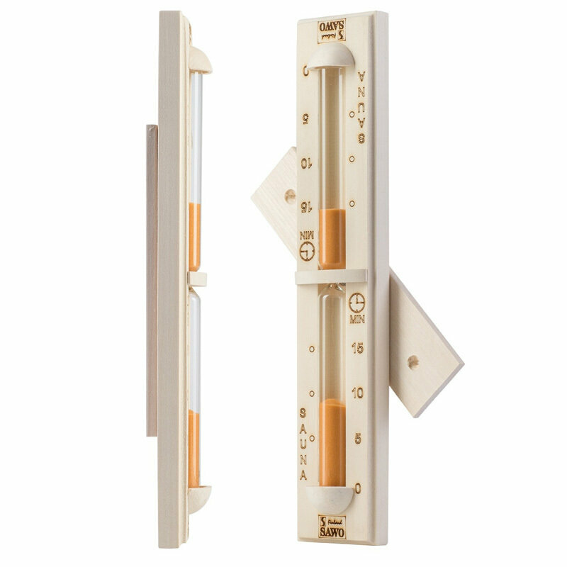 Финская компания SAWO выпускает широкий ассортимент песочных часов, которые предназначены для установки внутри парильного помещения. Материалом изготовления песочных часов может быть сосна, осина или кедр, а также комбинация материалов. Изделия отличаются привлекательным дизайном и прекрасно дополняют банный интерьер.
