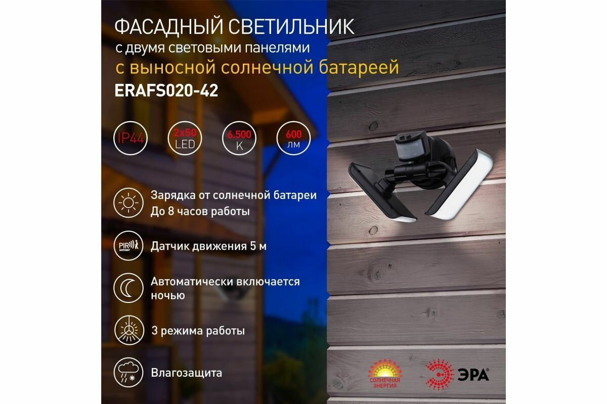 Светильник уличный ЭРА ERAFS020-42 на солнечной батарее 100LED, 600 lm - это современное и функциональное решение для освещения вашего дома, террасы, беседки или гаража.Светильник оснащен 200 светодиодами, которые обеспечивают световой поток 600 лм. Цветовая температура составляет 6500 К, что создает холодное белое освещение.Светильник имеет 3 режима работы: постоянного свечения, подсветки и реакции на движение. В статическом режиме свет включается с наступлением темноты, а в рабочем режиме (более ярком) - при появлении движения в радиусе 5 м. Поворотные панели позволяют настроить направление света индивидуально.Особенностью светильника является датчик движения, который обеспечивает экономию энергии и не позволяет свету просто так освещать пустое пространство. Светильник работает на солнечной батарее, что делает его экологически чистым, бесшумным и энергоемким.Светильник обладает высокой степенью защиты от пыли и влаги (IP44), что позволяет оставлять его на улице даже во время дождя.Светильник выполнен в современном стиле и имеет черный цвет арматуры и белый цвет плафона. Материал арматуры и плафона - пластик. Установка светильника осуществляется на стену.Светильник уличный ЭРА ERAFS020-42 - это надежное и функциональное решение для освещения вашего пространства.