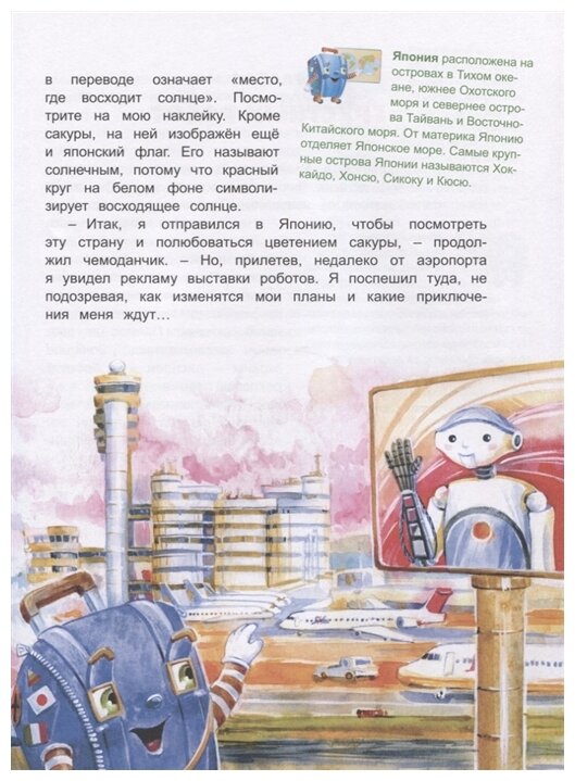 Замечательная книга о традициях и достопримечательностях Японии, о новейших достижениях техники и об уникальных обитателях природы. В поисках мальчика Макото говорящий чемоданчик Петя и роботы отправляются из Токио на острова Хоккайдо и Окинаву, а по пути с ними случаются весёлые приключения. Нам очень понравилось!