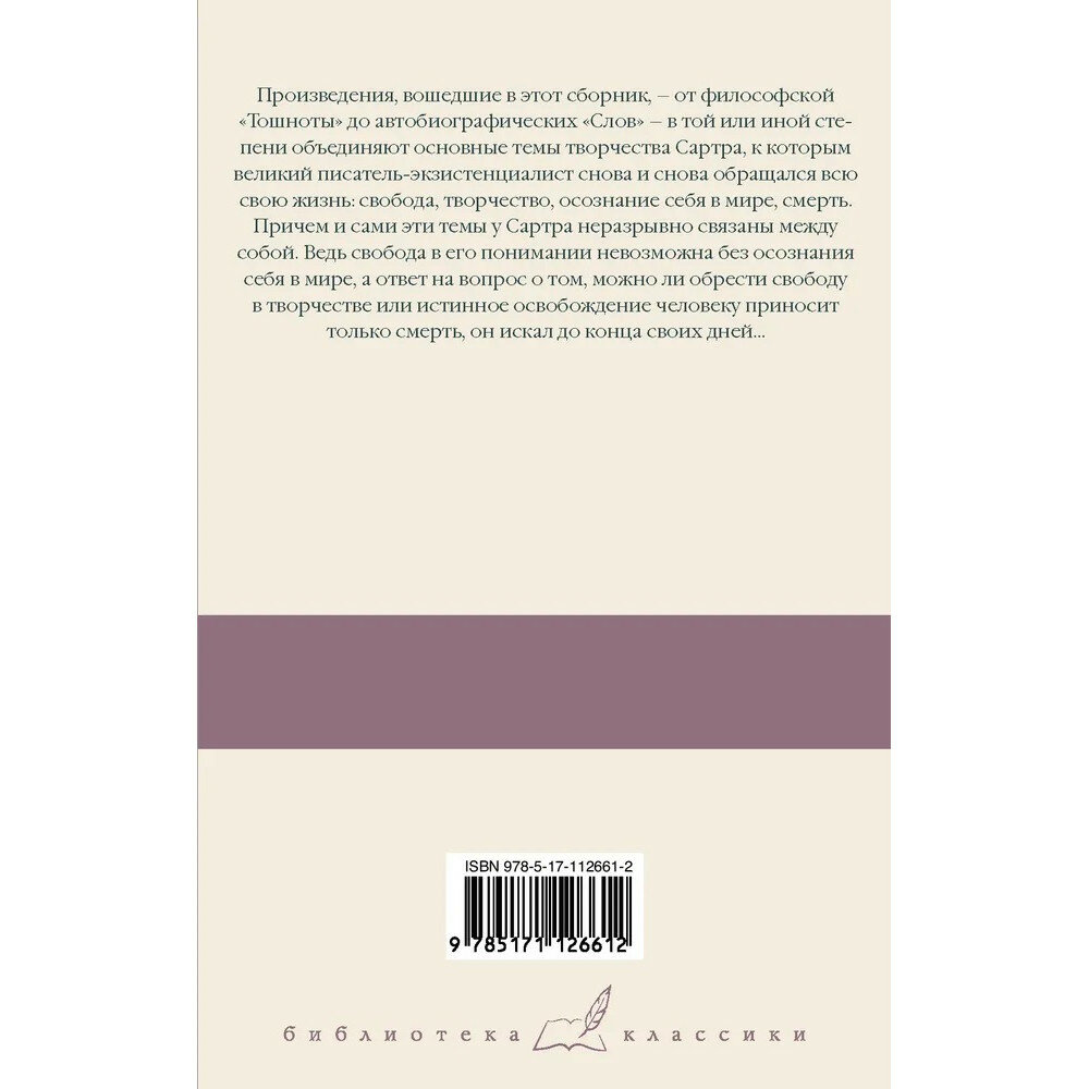 Произведения, вошедшие в этот сборник, - от философской "Тошноты" до автобиографических "Слов" - в той или иной степени объединяют основные темы творчества Сартра, к которым великий писатель-экзистенциалист снова и снова обращался всю свою жизнь: свобода, творчество, осознание себя в мире, смерть. Причем и сами эти темы у Сартра неразрывно связаны между собой. Ведь свобода в его понимании невозможна без осознания себя в мире, а ответ на вопрос о том, можно ли обрести свободу в творчестве или истинное освобождение человеку приносит только смерть, он искал до конца своих дней…