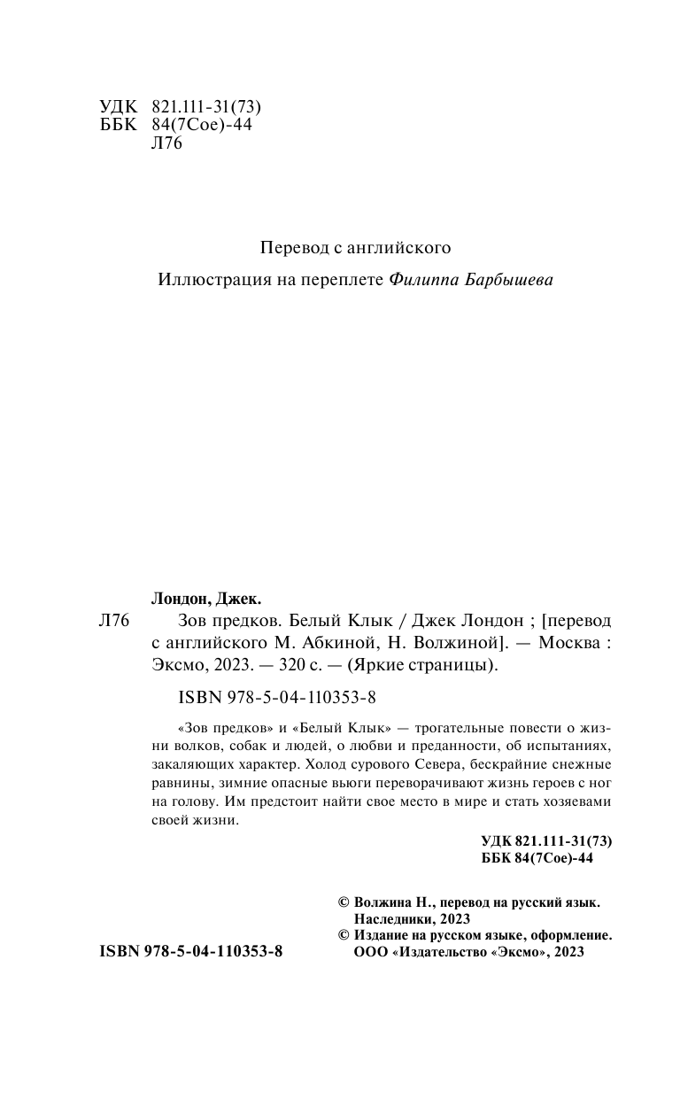Книга: Зов предков. Белый Клык (Джек Лондон); Эксмо, Редакция 1, 2020