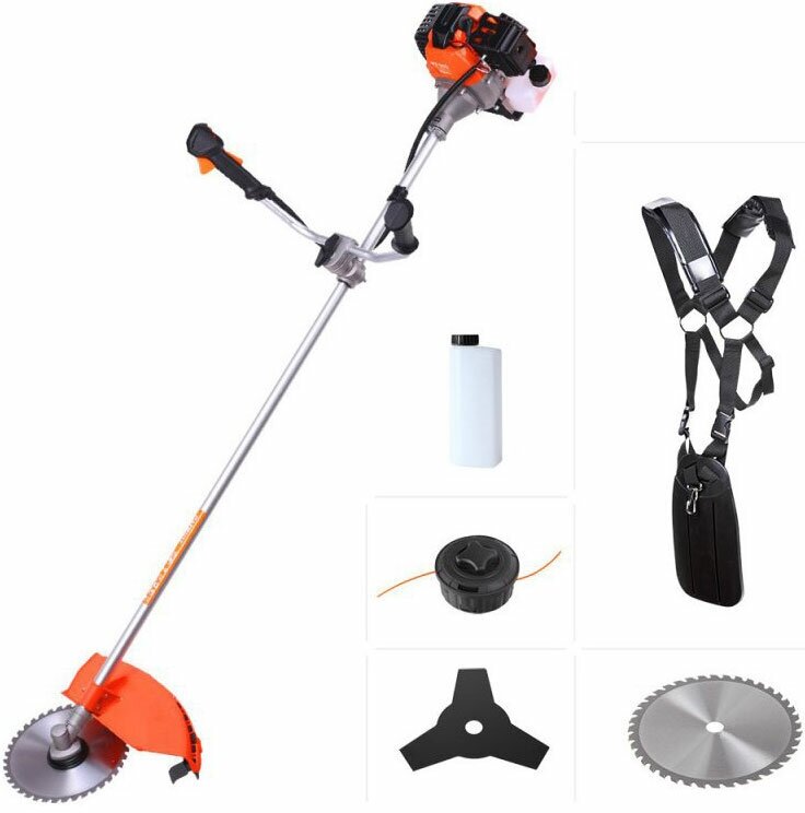 При замене лески на режущий нож применяется для скашивания сухостоя, жестких сорняков, небольших кустарников и тонких деревьев.