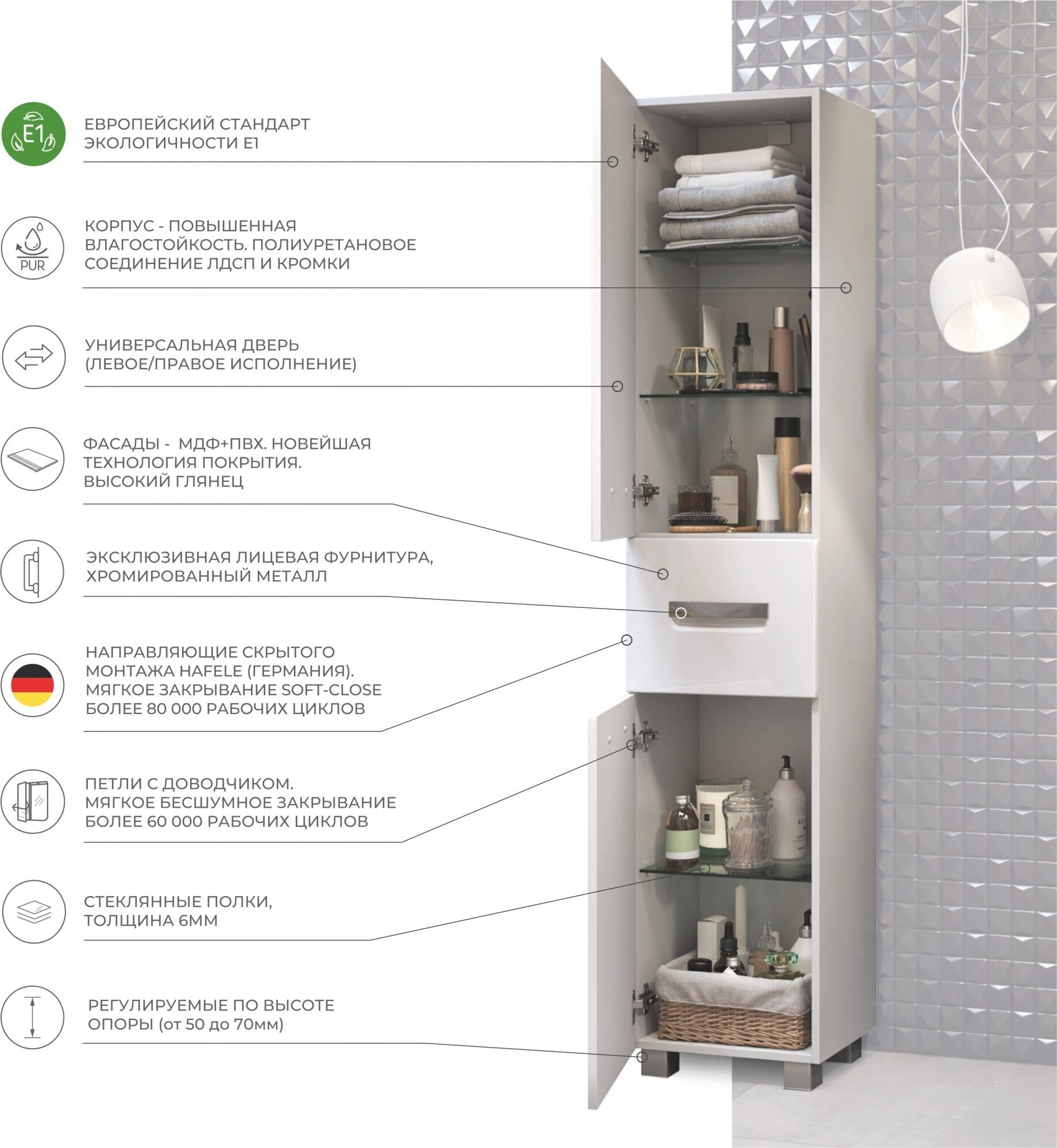 Пенал покупали давно, служит уже больше года и претензий к его качеству нет. Ванная достаточно влажная, но пенал выглядит как в день покупки. Внутри много свободного места, не переживайте, что выглядит громоздким, в стандартную ванную легко поместится. Цвет классический белый, фурнитура внутри достойная.