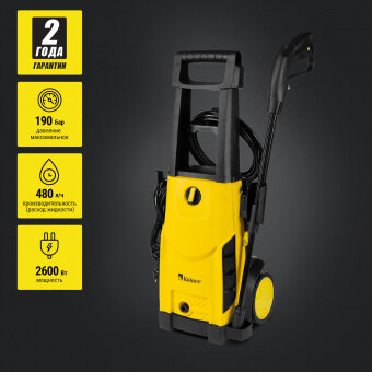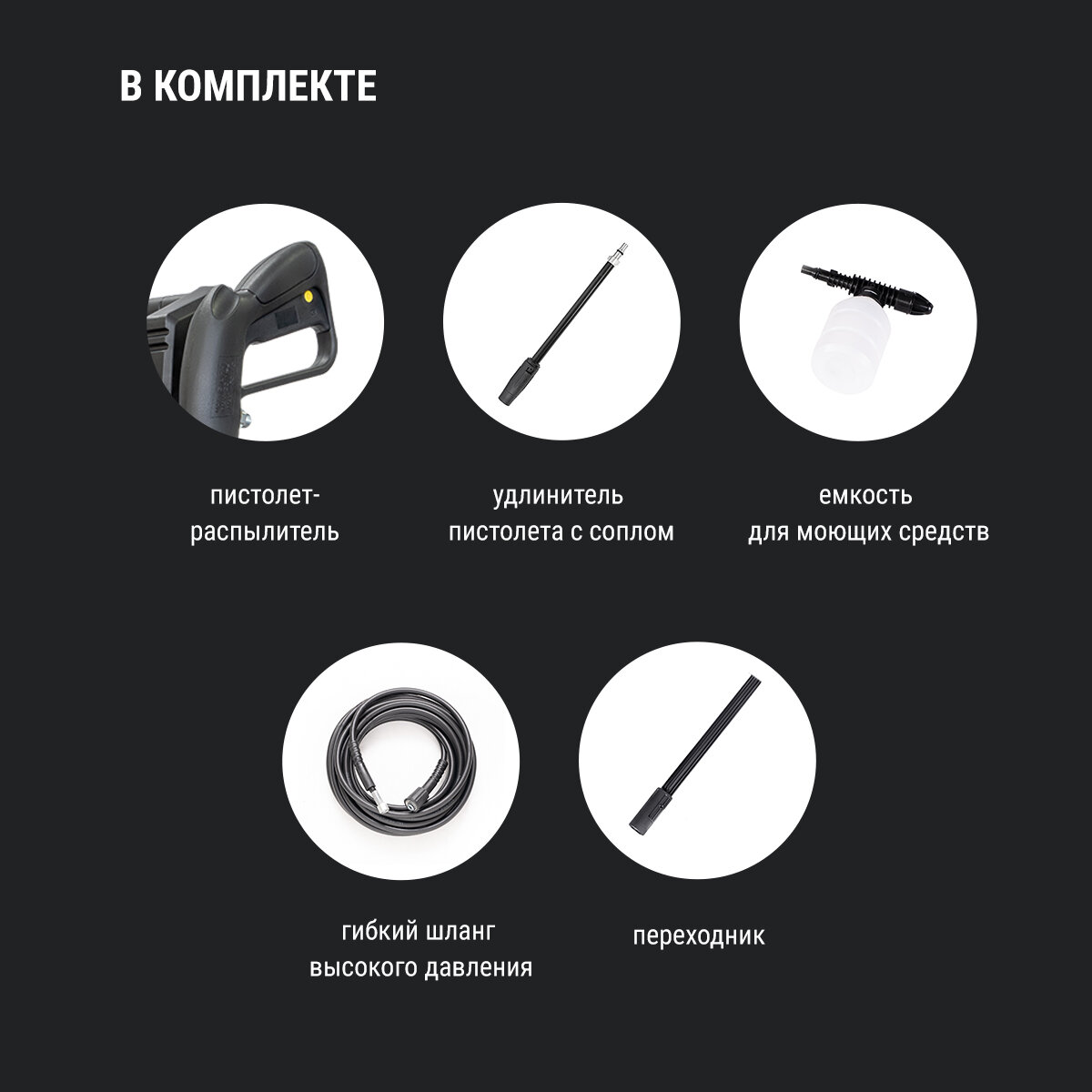 Функция самовсасывания: специальная конструкция насоса обеспечивает стабильный напор даже при минимальном давлении воды на входе мойки. Функция AUTO STOP: мотор останавливается автоматически при отжатой спусковой кнопке пистолета. Разборный пистолет-распылитель: для удобства транспортировки мойки. Шланг высокого давления 5 м: позволяет значительно увеличить радиус обрабатываемой поверхности. Крепления для аксессуаров на задней панели мойки: обеспечивают удобство в работе и транспортировке. Регулировка распылителя: позволяет изменить форму струи с мощной струи без распыления до веерного распыления под углом до 60°. емкость для моющих средств: использование моющих средств сокращает время очистки и способствует устранению сильных загрязнений. Транспортировочные колеса: удобны для комфортного использования и перемещения. Комплектация: пистолет-распылитель, удлинитель пистолета с соплом, гибкий шланг высокого давления, емкость для моющих средств, переходник, игла для очистки сопла. Гарантия: гарантийный срок эксплуатации на изделие составляет 2 года.