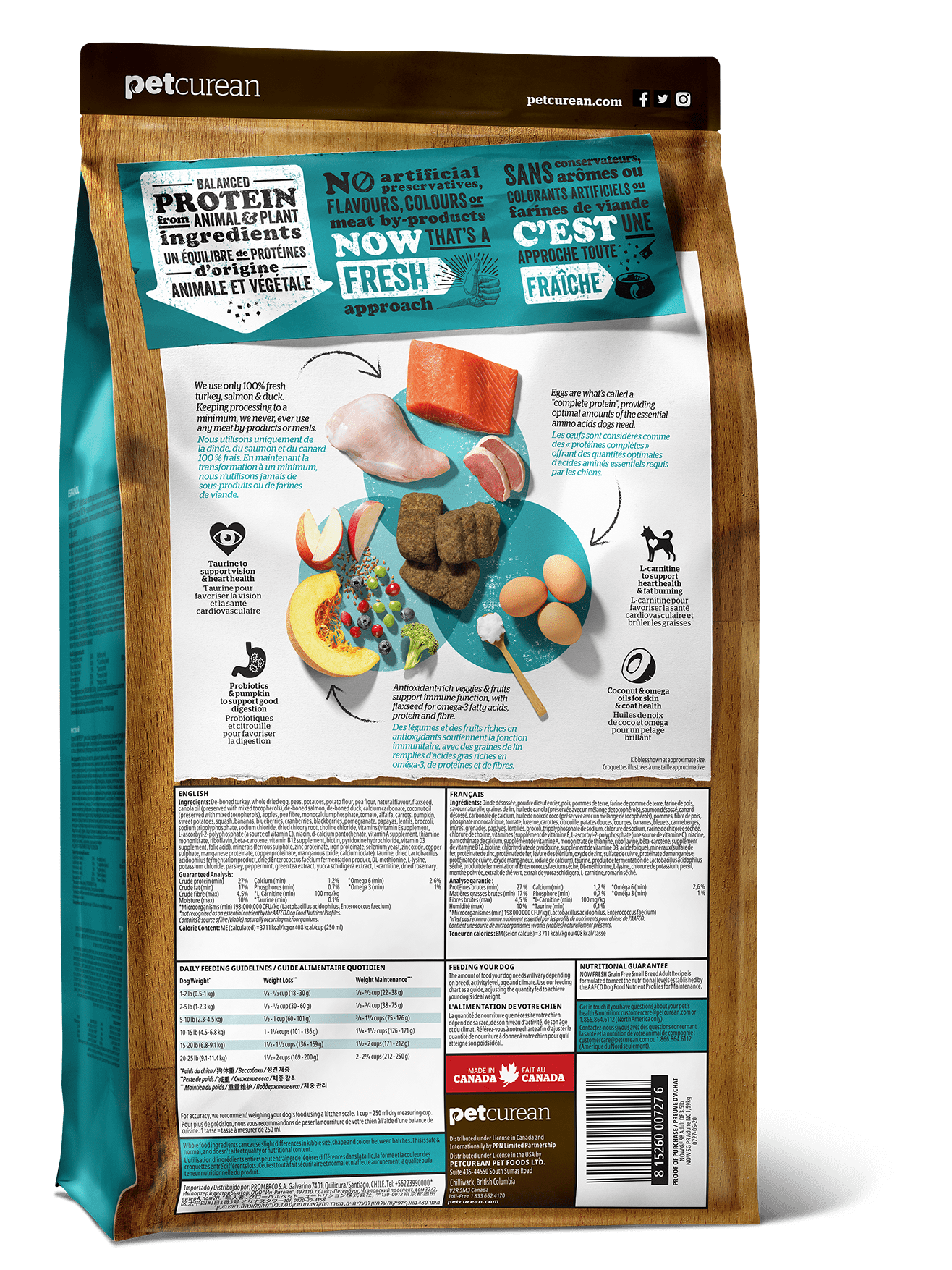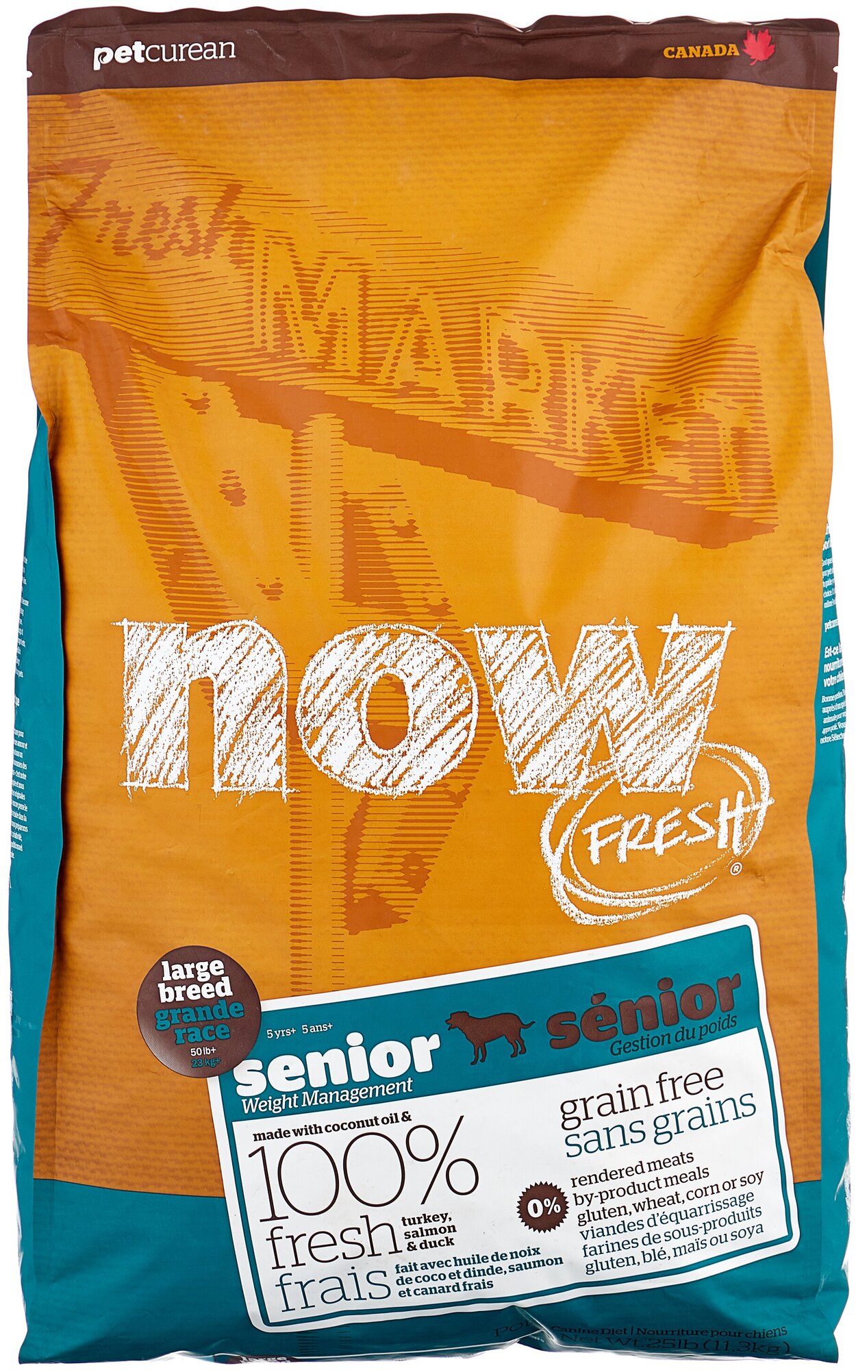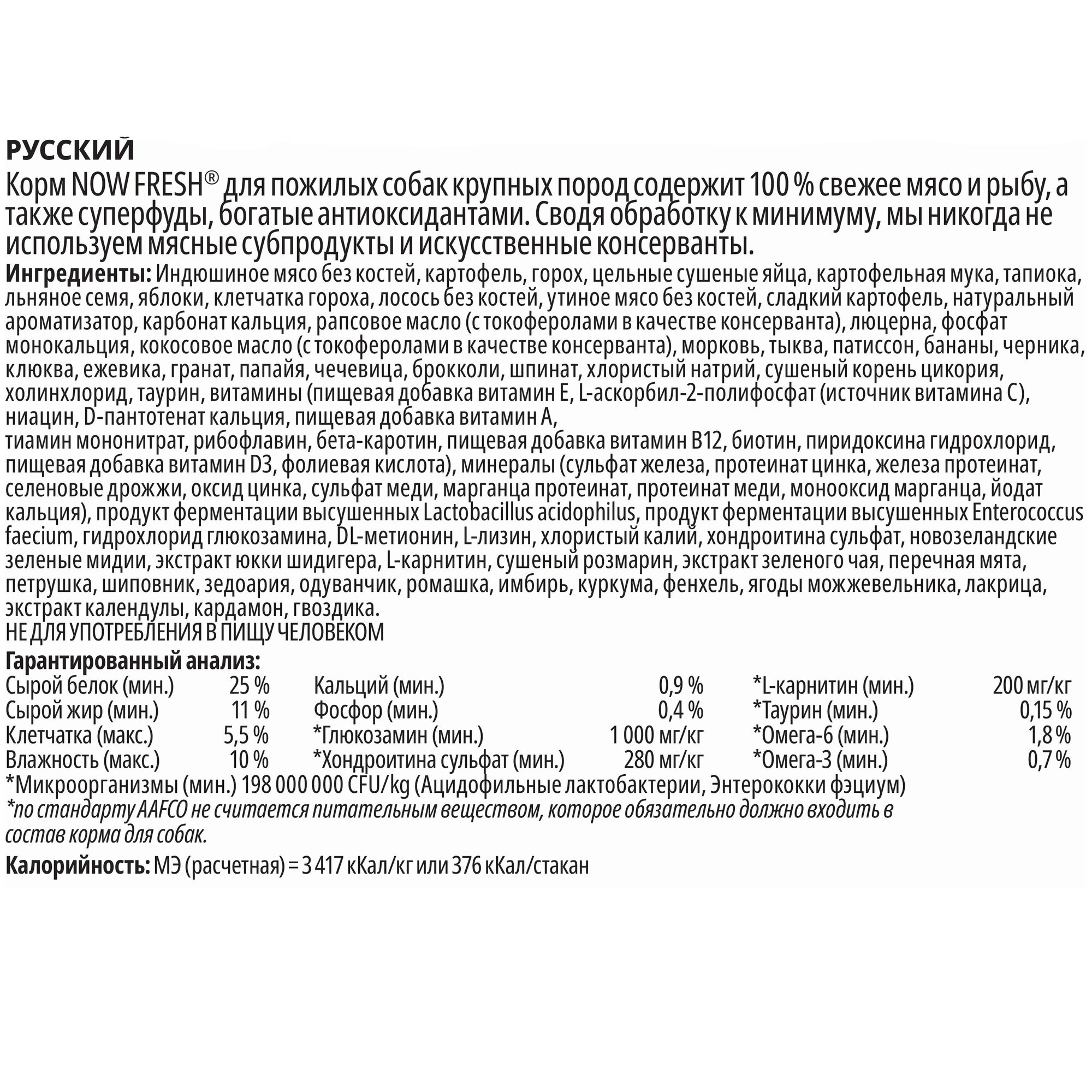 NOW FRESH Контроль веса - беззерновой корм для Собак Крупных пород с Индейкой, Уткой и овощами (Fresh Senior Large Breed Recipe Grain Free) прекрасно подходит пожилым собакам крупных пород старше 5лет и взрослым собакам крупных пород (1-5 лет) с избыточным весом. При производстве кормов Now используется только свежее мясо индейки, утки, лосося, кокосовое и рапсовое масло.Первый беззерновой корм со сбалансированным содержание белков и жиров, что помогает Вашему животному оставаться здоровым и сохранять отличную форму. Не содержит субпродуктов, красителей, говядины, мясных ингредиентов, выращенных на гормонах.Новозеландские зеленые мидии, глюкозамин и хондроитин способствуют здоровью суставовL-карнитин и таурин необходимы для здоровья сердечно-сосудистой системы. Пробиотики и пребиотики обеспечивают здоровое пищеварение.Омега-масла в составе необходимы для здоровой кожи и шерсти.Антиоксиданты укрепляют иммунную систему.Полезные овощи, ягоды, фрукты и травы, такие как горох, шпинат, клюква, тыква, мята перечная, ромашка, ежевика, ростки люцерны, ламинария, чечевица и морковь.