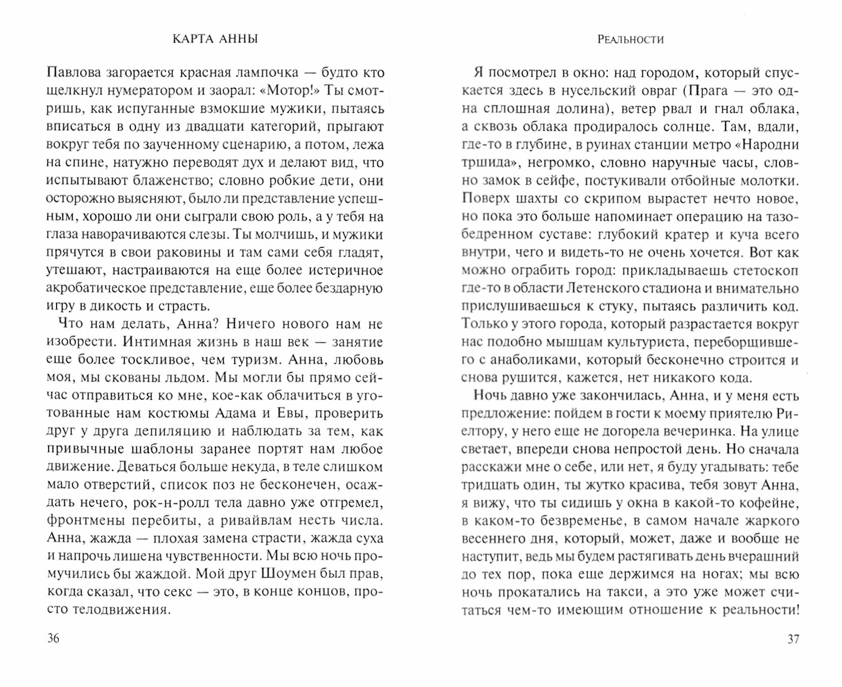 "Ты отражаешься в стекле, как в зеркале, разглядываешь свое лицо и отчетливо видишь на нем каждую мелкую неровность. Человек столько всего несет в себе, удивляешься ты, столько чужого, о чем он никогда даже и не просил. Анна, ты ходячий знак вопроса. Ты загадочна, как трейлер к голливудскому блокбастеру. Ты успешна и неплохо зарабатываешь. Ты совершенна, мир вокруг тебя совершенен, и в этом-то вся загвоздка, потому что ты сливаешься с фоном, потому что тебе начинает не хватать ошибки, хоть какого-нибудь изъяна…"