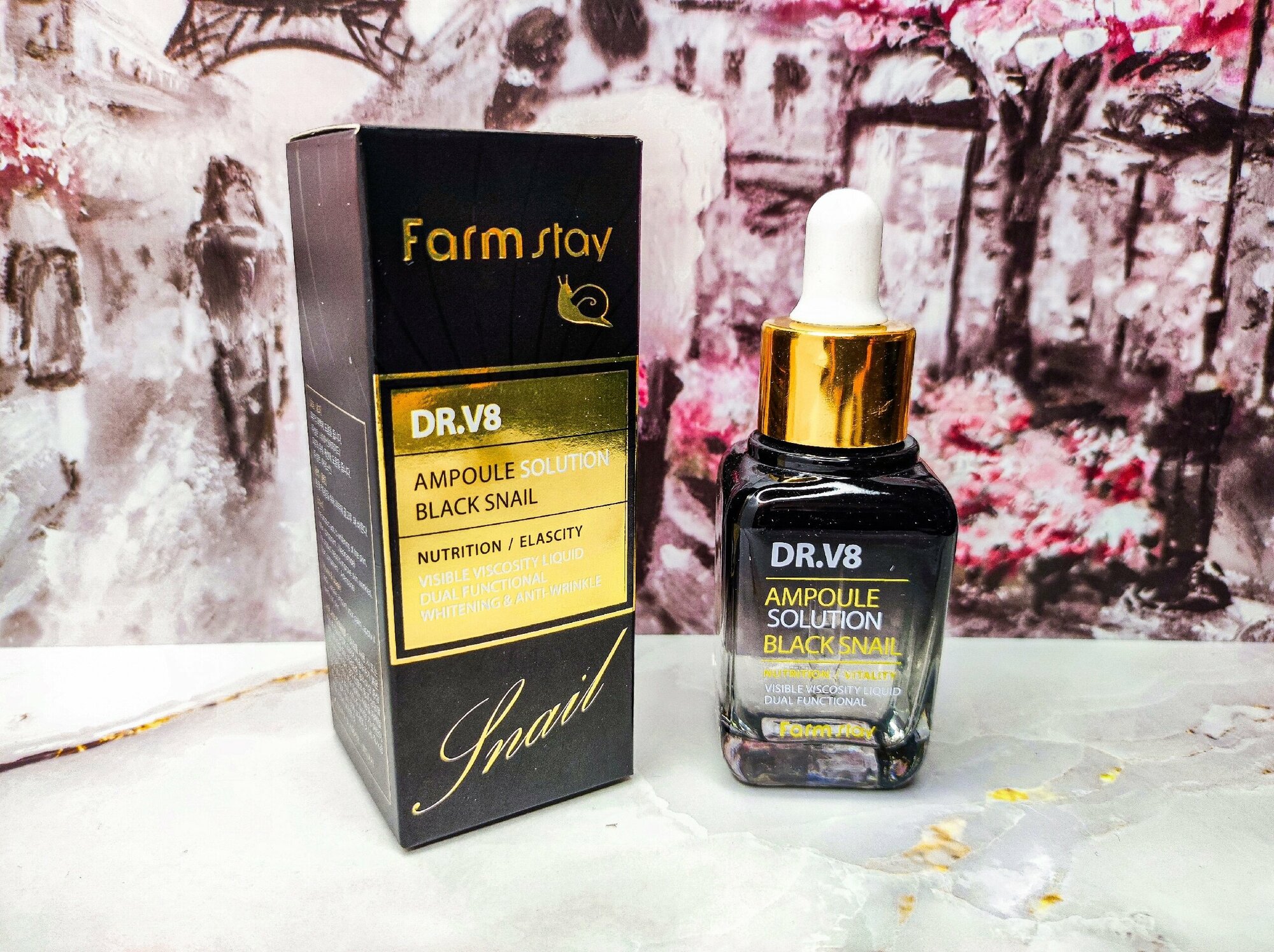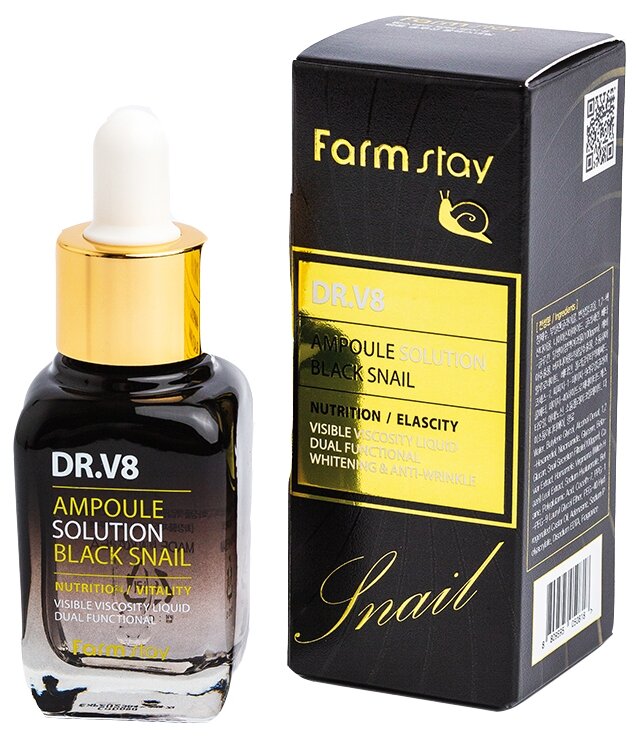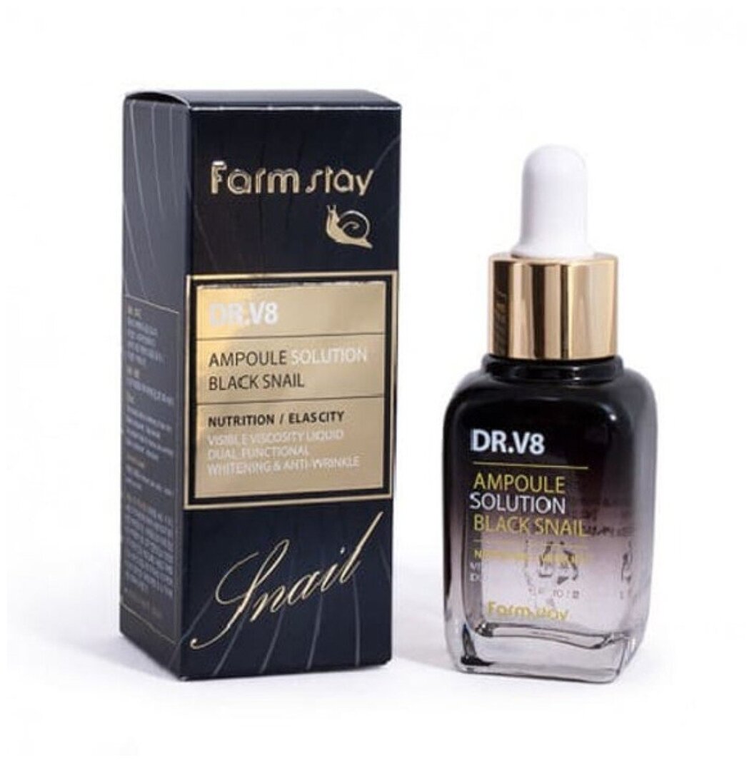Ампульная сыворотка Farm Stay R-V8 Ampoule SoluTion Black Snail с муцином черной улитки и экстрактом икры обеспечивает регенерацию, борьбу со старением, защиту, увлажнение и питание. Сыворотка Farm Stay R-V8 Ampoule SoluTion Black Snail не только удаляет морщинки, но и повышает упругость и эластичность кожи. Выравнивает тон кожи, осветляет пигментацию и постакне. Подходит даже для чувствительной кожи, защищает ее от раздражений.