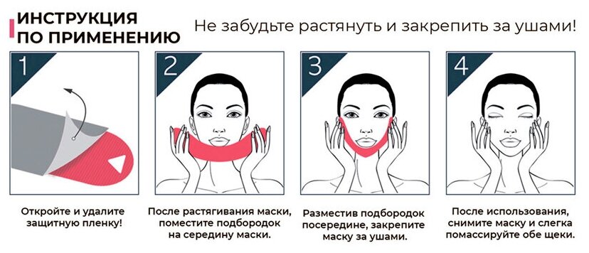 Откройте и удалите защитную пленку. После растягивания маски поместите подбородок на середину маски. Разместите подбородок посередине, закрепите маску за ушами. После импользования снимите маску и слегка помассируйте обе щеки