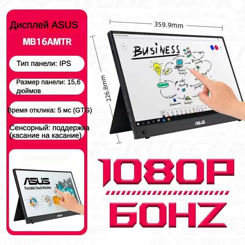 | Прочие особенности и свойства | Портативный USB-монитор ASUS ZenScreen Touch MB16AMT:15,6”, IPS, Full-HD, 10-пальцевый сенсорный интерфейс, встроенный аккумулятор, USB-C, micro-HDMI, совместимость с ноутбуками, смартфонами, игровыми консолями и камерами,,Встроенный аккумулятор 7800 мА·ч, до 4 часов работы в автономном режиме; складной чехол в комплекте |