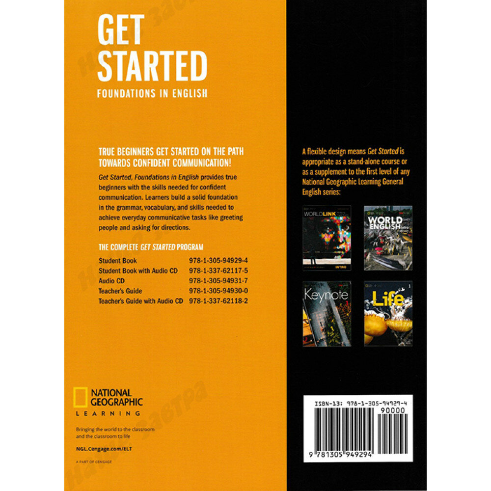 Get Started, Foundations in English provides true beginners with the skills needed for confident communication. Learners build a solid foundation in the grammar, vocabulary, and skills needed to achieve everyday communicative tasks like greeting people and asking for directions. Get Started helps instructors navigate the low-level classroom in English through ample support in the Teacher's Guide. A flexible design means Get Started is appropriate for use as a stand-alone course or a supplement to the first level of any National Geographic Learning General English series: World Link, World English, Keynote, Life.