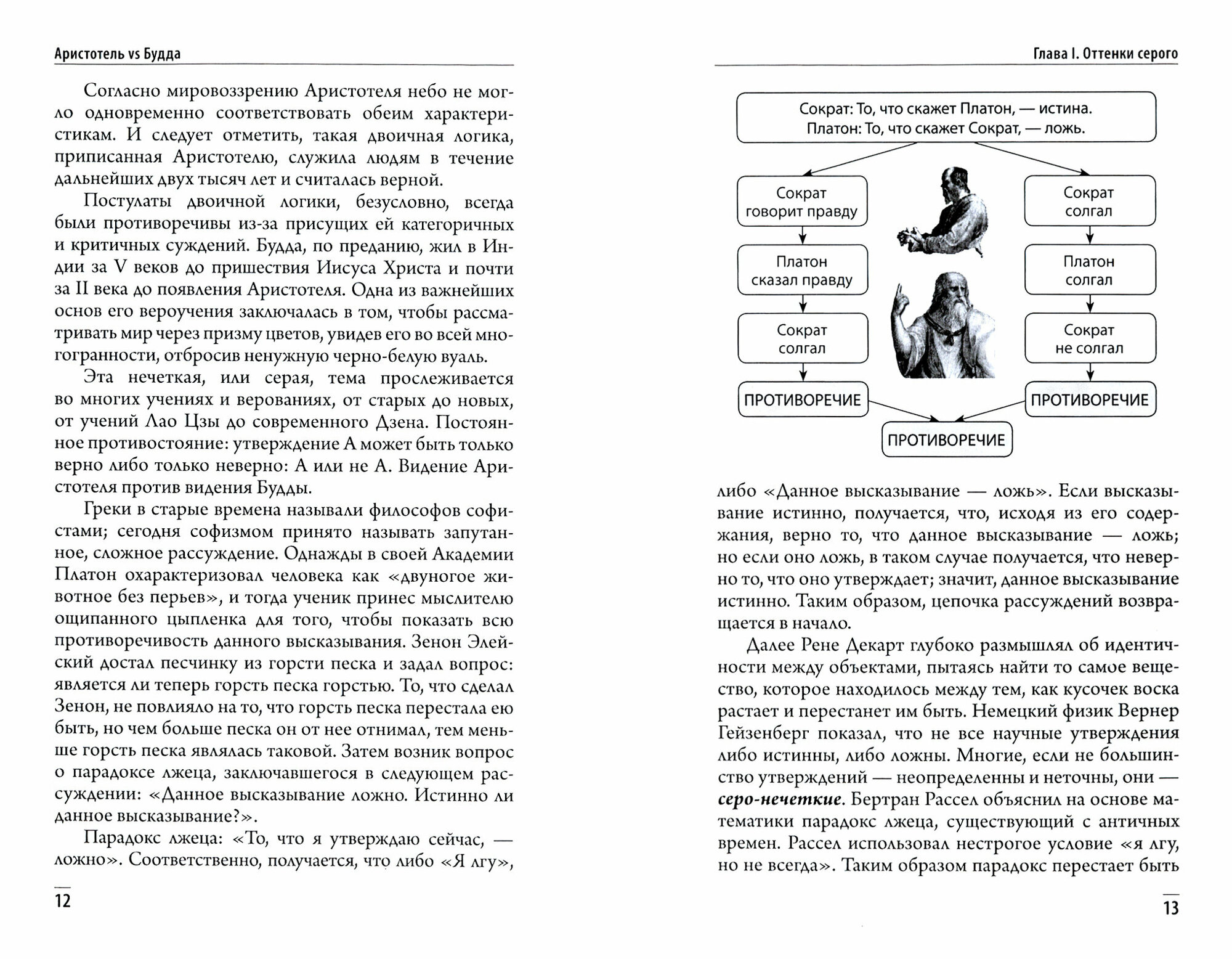 В качестве доказательства приводит массу примеров. Например, можно ли сказать что автомобиль занял место 34, если он частично заехал и на место 35. Да или нет? Вот мол все в жизни серое, а не черно-белое. Разве тут проблема в логике? Просто неверно построена модель ситуации, неверно определены ее понятия. Если определим понятие «занял» так: место считается занятым если если любой другой возможный автомобиль уже не может его занять (и при этом мог бы если частичного наезда не было бы). Вот вам и однозначный ответ всегда будет.