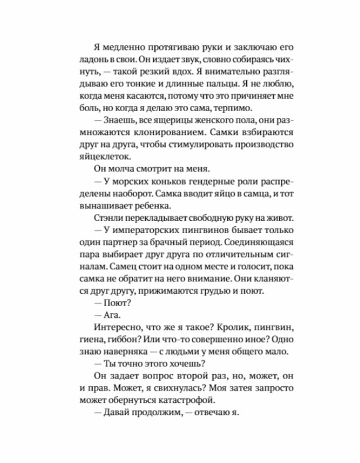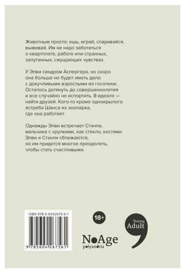 Животным просто: ешь, играй, спаривайся, выживай. Им не надо заботиться о квартплате, работе или странных, запутанных, смущающих чувствах.У Элви синдром Аспергера, но скоро она больше не будет иметь дело с докучливыми взрослыми из госопеки. Осталось дотянуть до совершеннолетия и все случайно не испортить. В идеале — найти друзей. Кого-то кроме однокрылого ястреба Шанса из зоопарка, где она работает.Однажды Элви встречает Стэнли, мальчика с хрупкими, как стекло, костями. Элви и Стэнли сближаются, но им придется многое преодолеть, чтобы стать счастливыми.
