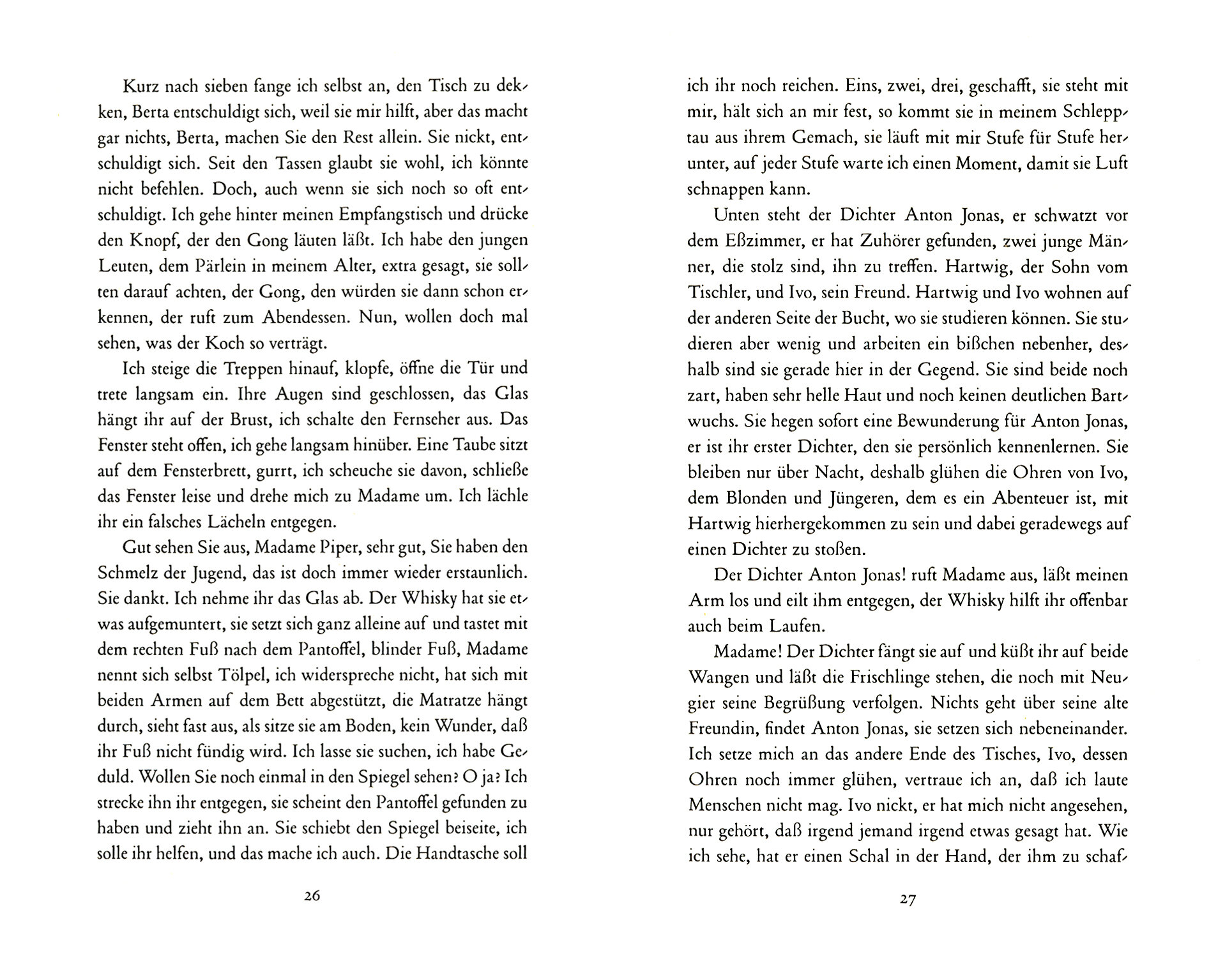 Drausen die weite Bucht, drinnen der Empfangstisch des engen Hotels: dazwischen spannt sich eine Buhne, auf der sich die Stammgaste jedes Jahr ihre Einsatze zuflustern. Das Hotel gehort einer jungen Frau, die es von ihrer Mutter geerbt hat und keinen Sinn hat fur "Tanztee", und da ist der neue Koch, der Pikantes liebt und von der Kuche aus den Laden ubernehmen will. Die Stammgaste hat er schon auf seiner Seite.